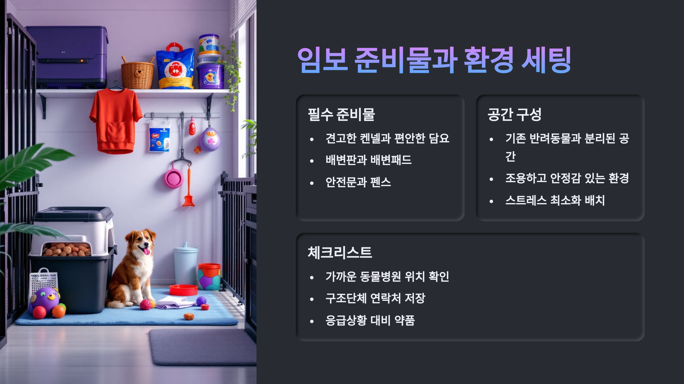 임보를 잘 시작하려면 준비가 80%예요. 한 생명이 우리 집으로 오는 만큼, 정성껏 환경을 만들어주는 것만으로도 그 아이에게는 세상을 얻는 거나 다름없어요. 🌈