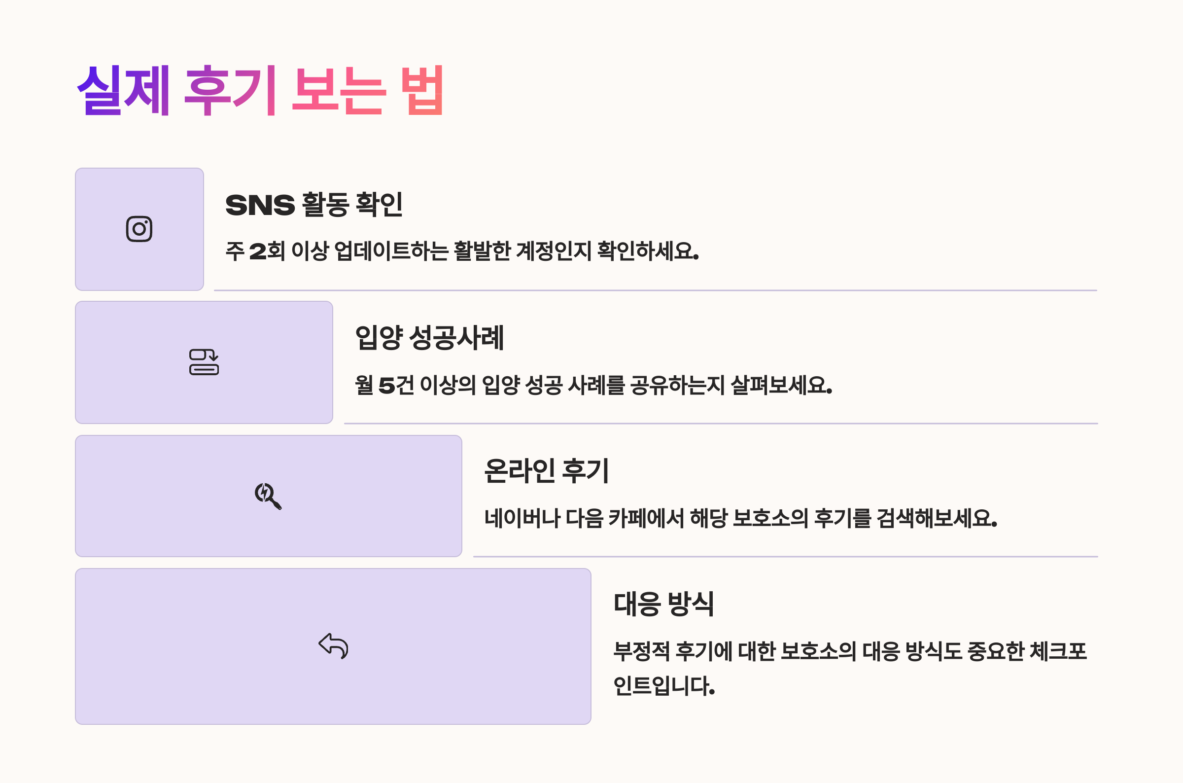 반면, “돈만 요구하고 아무 설명이 없었다”, “보호소 내부가 너무 더럽고 냄새가 났다”, “아이 상태가 안 좋았다” 같은 부정적인 내용이 반복된다면 반드시 조심해야 해요. 이런 후기는 단순한 불만이라기보단 경고일 수 있어요. ⚠️