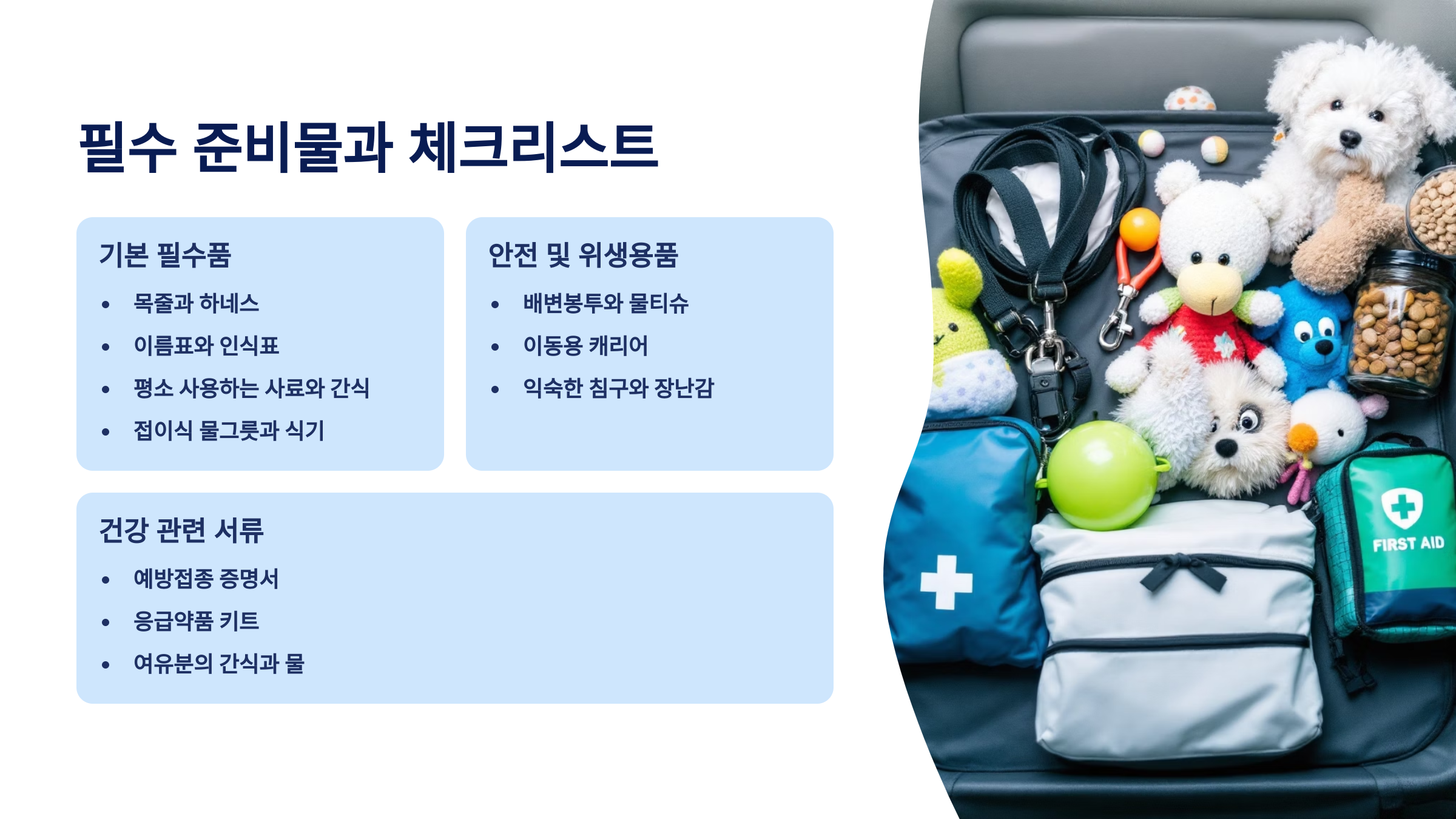 준비물을 챙길 때는 우선순위를 정하는 것이 중요해요. 생명과 직결되는 사료, 물, 의료용품이 최우선이고, 그다음이 안전용품, 편의용품 순이에요. 또한 무게와 부피도 고려해야 해요. 특히 차량 여행이 아니라면 가방 무게 제한이 있을 수 있거든요. 저는 모든 준비물을 체크리스트로 만들어서 출발 전날 두 번 정도 확인했어요. 내가 생각했을 때 가장 유용했던 건 응급상황 대비 연락처 리스트였어요. 실제로는 사용하지 않았지만, 마음의 안정감이 전혀 달랐거든요. 🎒