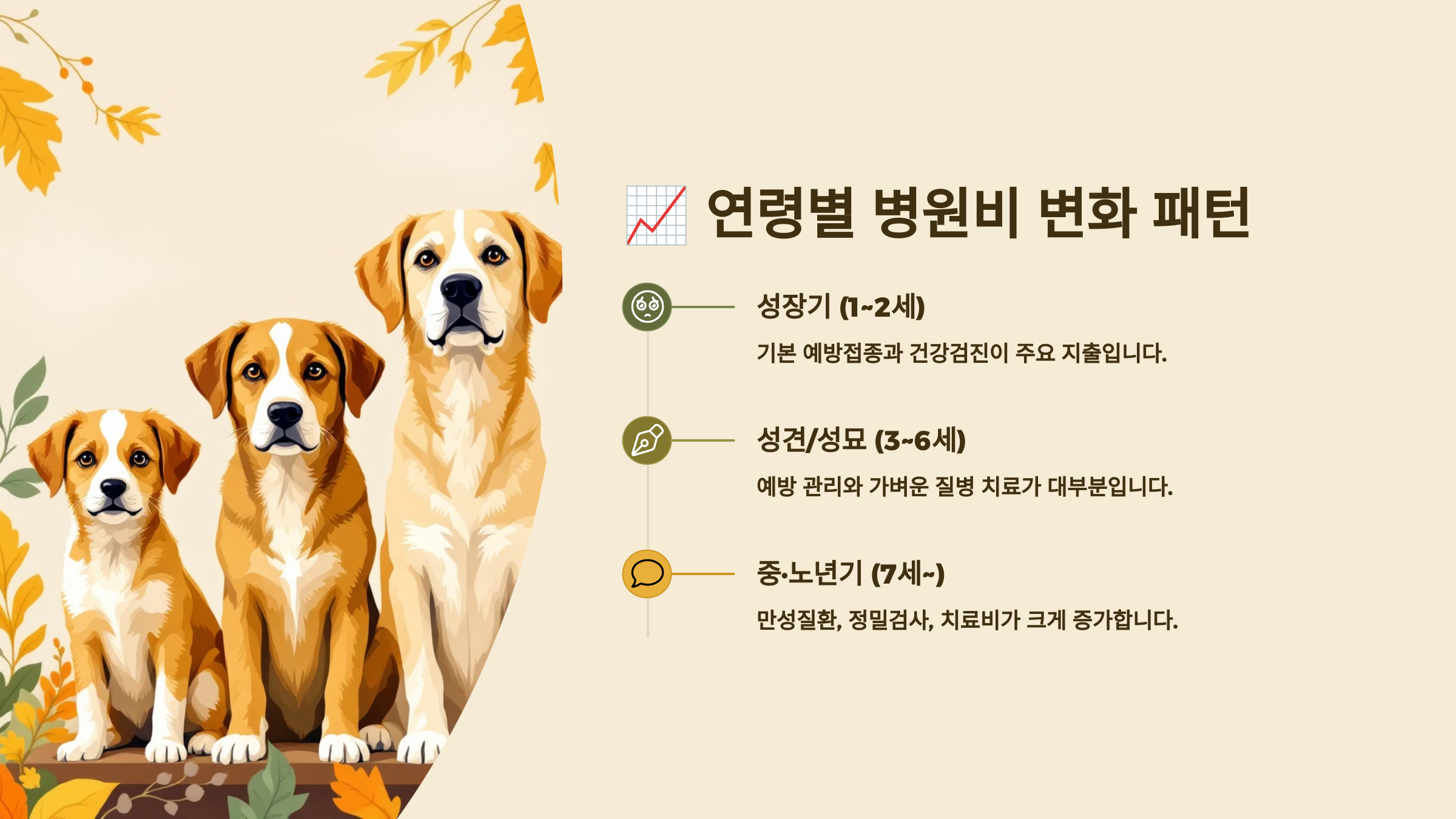 반려동물의 연령에 따라 병원비 패턴이 확실히 달라져요. 어린 시절에는 주로 예방접종과 성장 관련 검진 비용이 많이 들어가고, 성견기에는 비교적 안정적이다가 노령기에 접어들면서 다시 의료비가 급증하는 패턴을 보여요. 실제 5년간의 병원비 기록을 분석해보니 이런 패턴이 뚜렷하게 나타났어요.