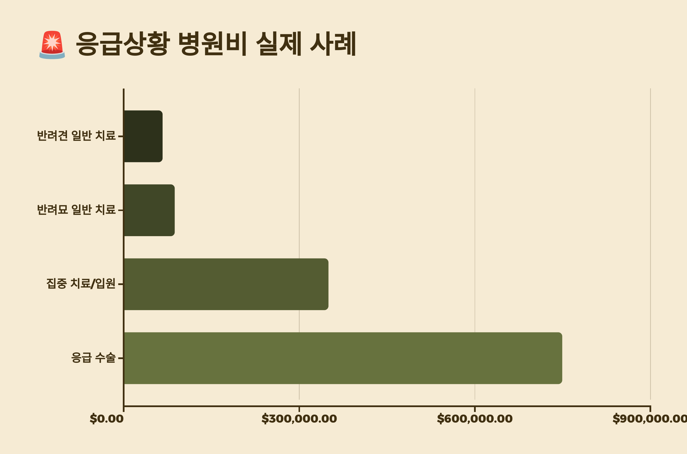 두 번째는 산책 중 교통사고가 발생한 경우예요. 다행히 큰 부상은 없었지만 X-ray 촬영과 통증 관리를 위한 치료가 필요했어요. 응급실 기본료 10만원, X-ray 촬영 15만원, 진통제 주사와 처방전까지 해서 총 40만원 정도가 들어갔죠. 만약 골절이나 내장 손상이 있었다면 수술비까지 추가로 수백만원이 필요했을 거예요.
