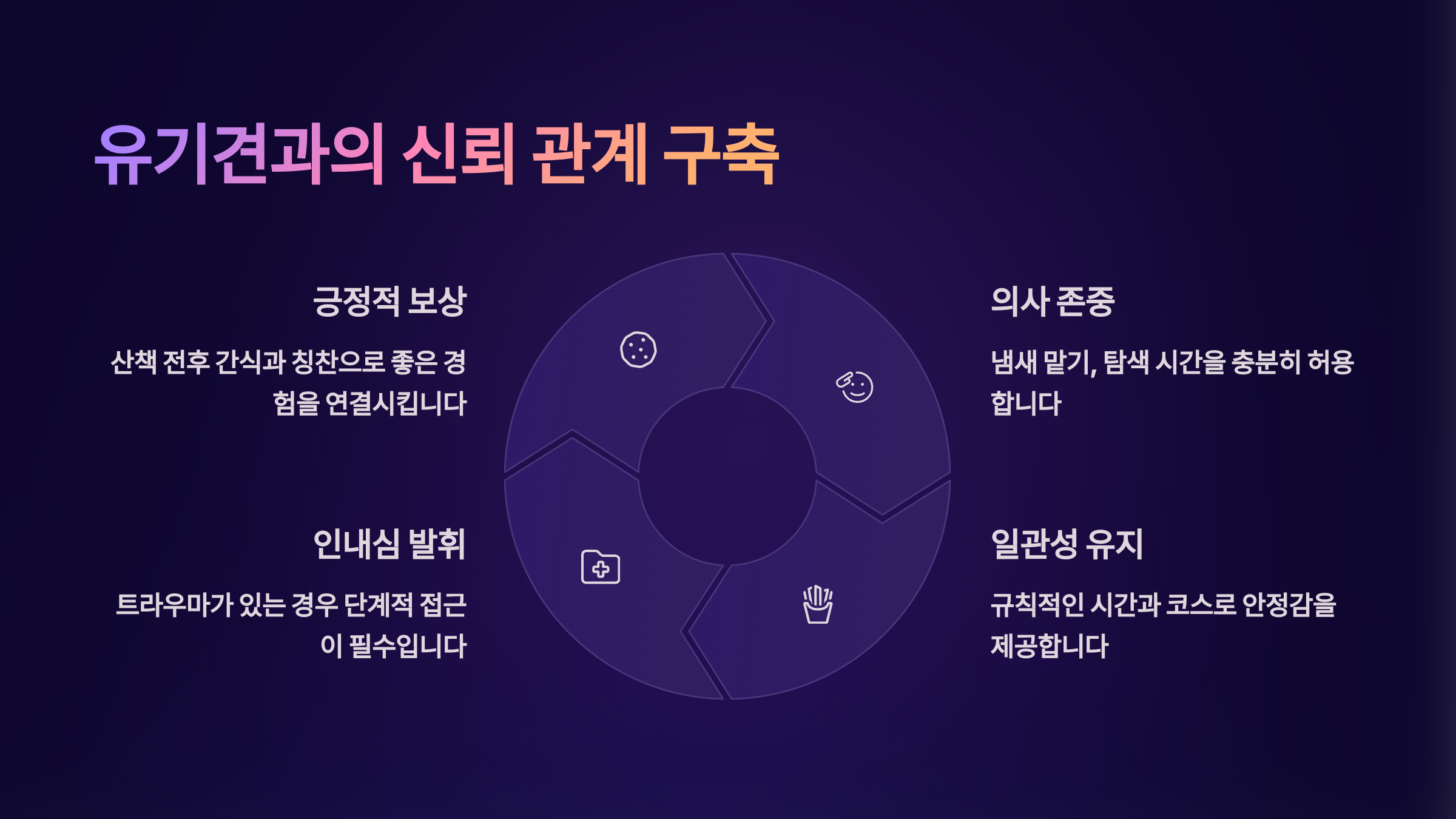유기견과의 신뢰 관계 구축은 시간과 인내가 필요한 과정이에요. 가장 중요한 것은 일관성 있는 행동을 보여주는 것이에요. 유기견들은 과거의 경험 때문에 사람에 대한 신뢰가 부족할 수 있어요. 그래서 매번 같은 방식으로 접근하고, 예측 가능한 행동을 보여주는 것이 중요해요. 갑작스러운 움직임이나 큰 소리는 피하고, 항상 부드럽고 차분한 목소리로 대화하는 것이 좋아요. 처음에는 유기견이 경계심을 보이더라도 꾸준히 같은 방식으로 접근하면 점차 마음을 열게 되요.