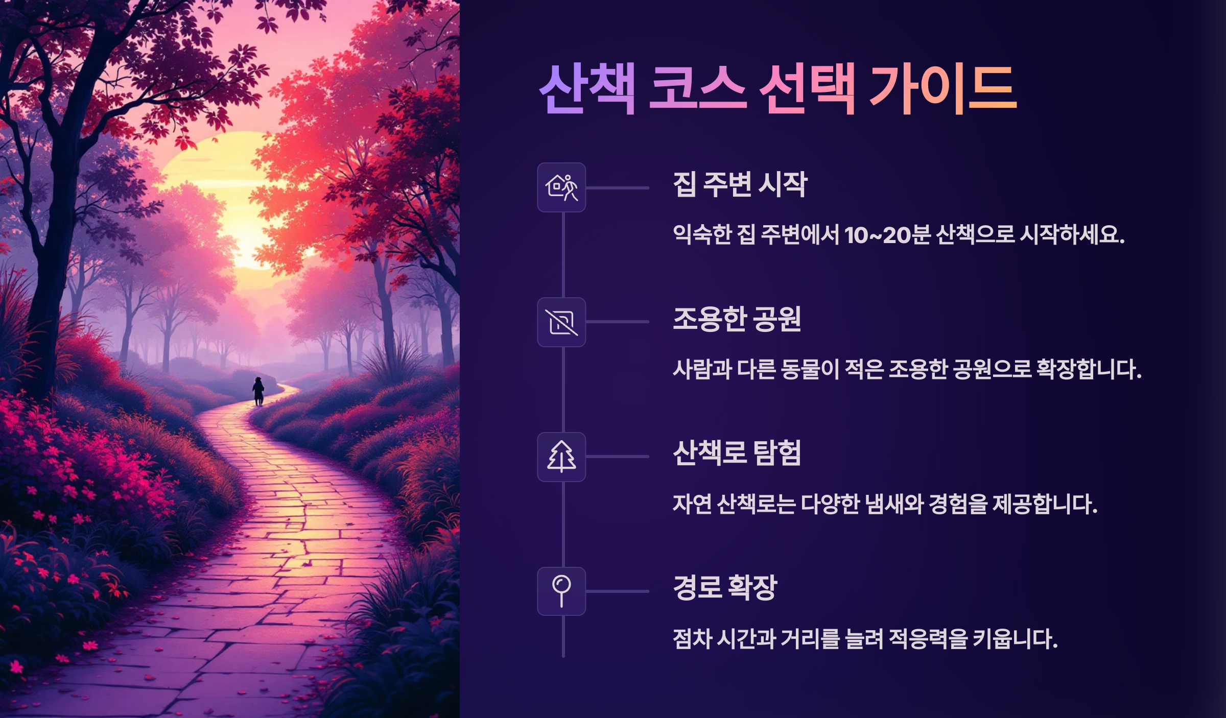 두 번째로 고려해야 할 것은 다른 개들과의 만남 빈도예요. 유기견들은 사회화가 부족할 수 있기 때문에 처음에는 다른 개들을 많이 만나지 않는 코스를 선택하는 것이 좋아요. 인기 있는 도그런이나 애견 카페 근처보다는 한적한 산책로가 더 적합해요. 하지만 시간이 지나면서 유기견이 적응해가면 점진적으로 다른 개들을 만날 수 있는 코스로 변경해볼 수 있어요. 이 과정에서 유기견의 반응을 주의깊게 관찰하는 것이 중요해요.