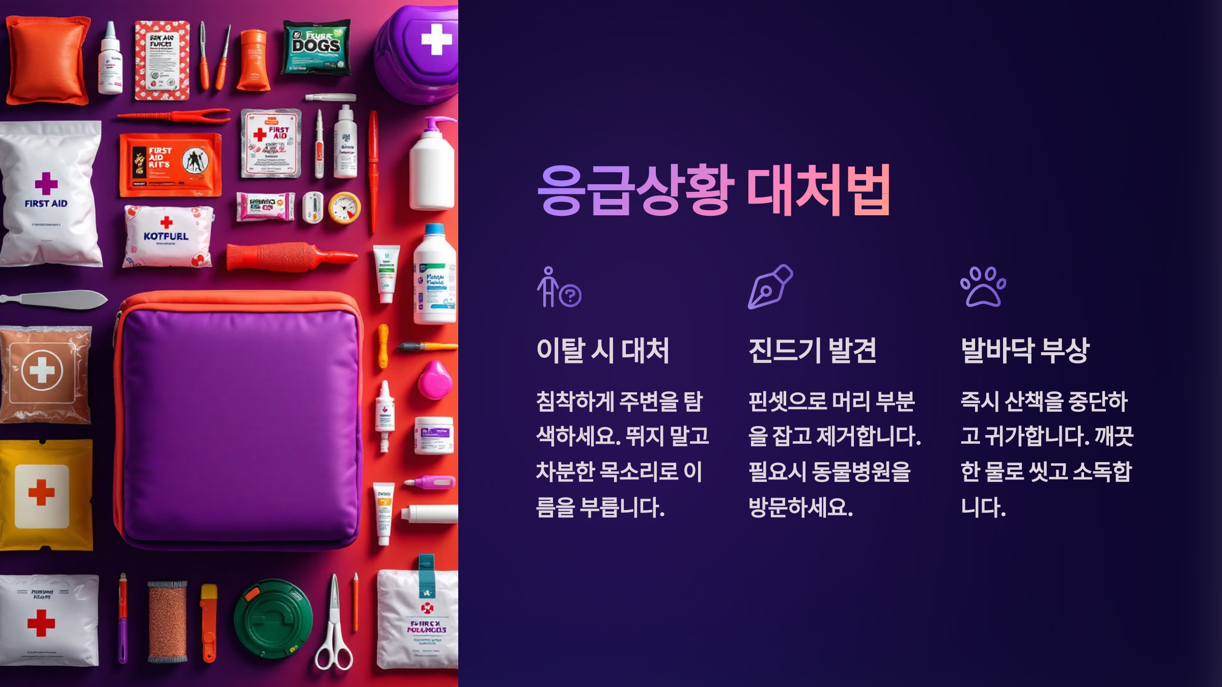유기견 산책 중 응급상황이 발생할 수 있어요. 가장 흔한 응급상황 중 하나는 유기견이 갑작스럽게 도망가려 하는 것이에요. 이런 상황에서는 절대 소리를 지르거나 쫓아가면 안 되요. 대신 차분하고 부드러운 목소리로 유기견의 이름을 불러주면서 천천히 접근해야 해요. 만약 목줄이 빠져서 자유로워진 상태라면 더욱 조심스럽게 접근해야 해요. 간식을 보여주거나 낮은 자세로 앉아서 유기견이 스스로 다가올 수 있도록 유도하는 것이 효과적이에요.