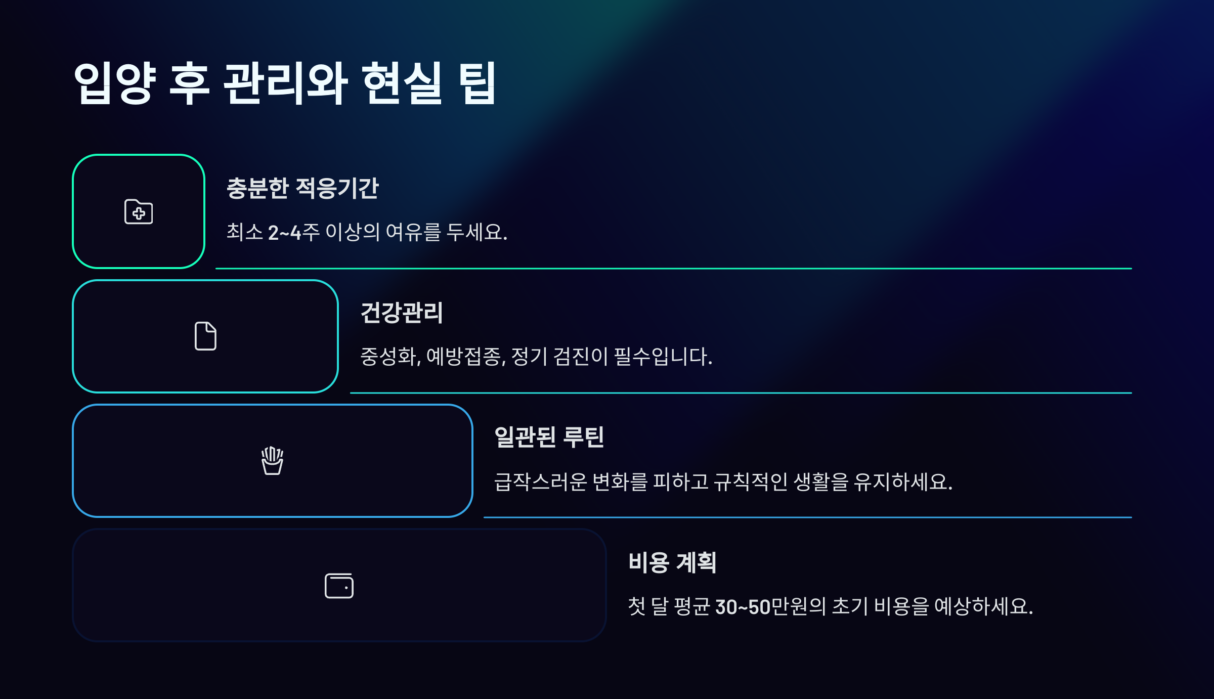 체계적인 관리와 꾸준한 관심이 성공적인 입양의 열쇠예요. 처음에는 힘들어도 시간이 지나면서 서로에게 없어서는 안 될 소중한 존재가 된답니다! 🔑