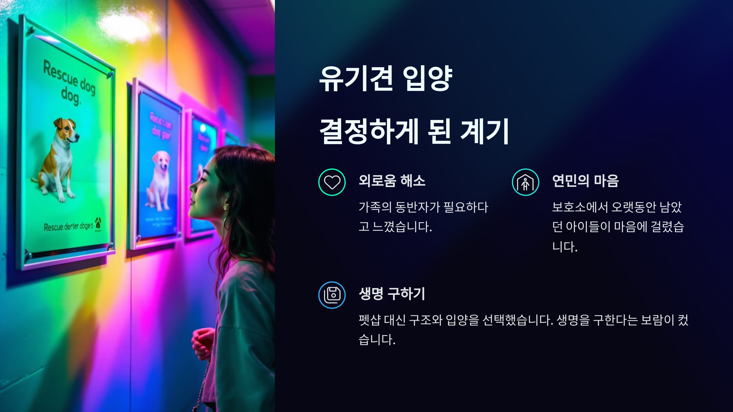 하지만 이 모든 어려움을 감수하고도 남을 만큼 유기견 입양은 의미 있고 보람찬 일이에요. 한 생명을 구했다는 뿌듯함과 무조건적인 사랑을 나누는 행복은 어떤 것과도 바꿀 수 없는 소중한 경험이에요. 인터뷰에 참여한 모든 입양자들이 공통적으로 말한 것은 "다시 선택해도 똑같이 할 것"이라는 것이었어요.