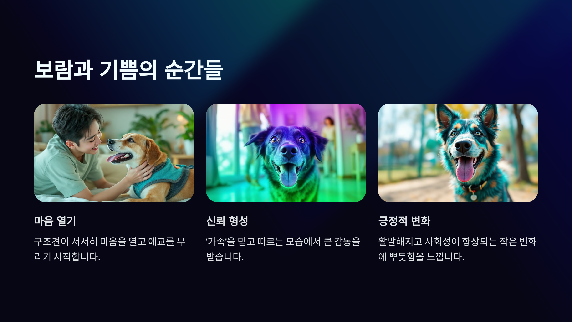 박준호씨는 바둑이와의 특별한 순간을 이렇게 회상했어요. "바둑이가 산책 중에 다른 강아지와 친해지는 모습을 봤을 때 정말 뿌듯했어요. 처음에는 다른 개들을 무서워했는데, 꾸준한 사회화 훈련 끝에 친구도 사귀고 즐겁게 노는 모습을 보니까... 제가 바둑이에게 새로운 삶을 선물해준 것 같아서 너무 기뻤어요." 유기견들이 점차 자신감을 회복하고 행복해하는 모습을 지켜보는 것은 입양자들에게 말할 수 없는 성취감을 줘요.