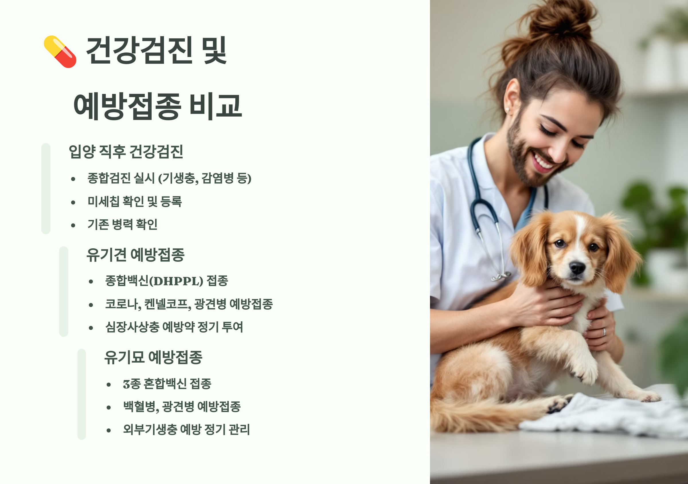 💊 유기견 vs 유기묘 건강검진 및 예방접종 비교표