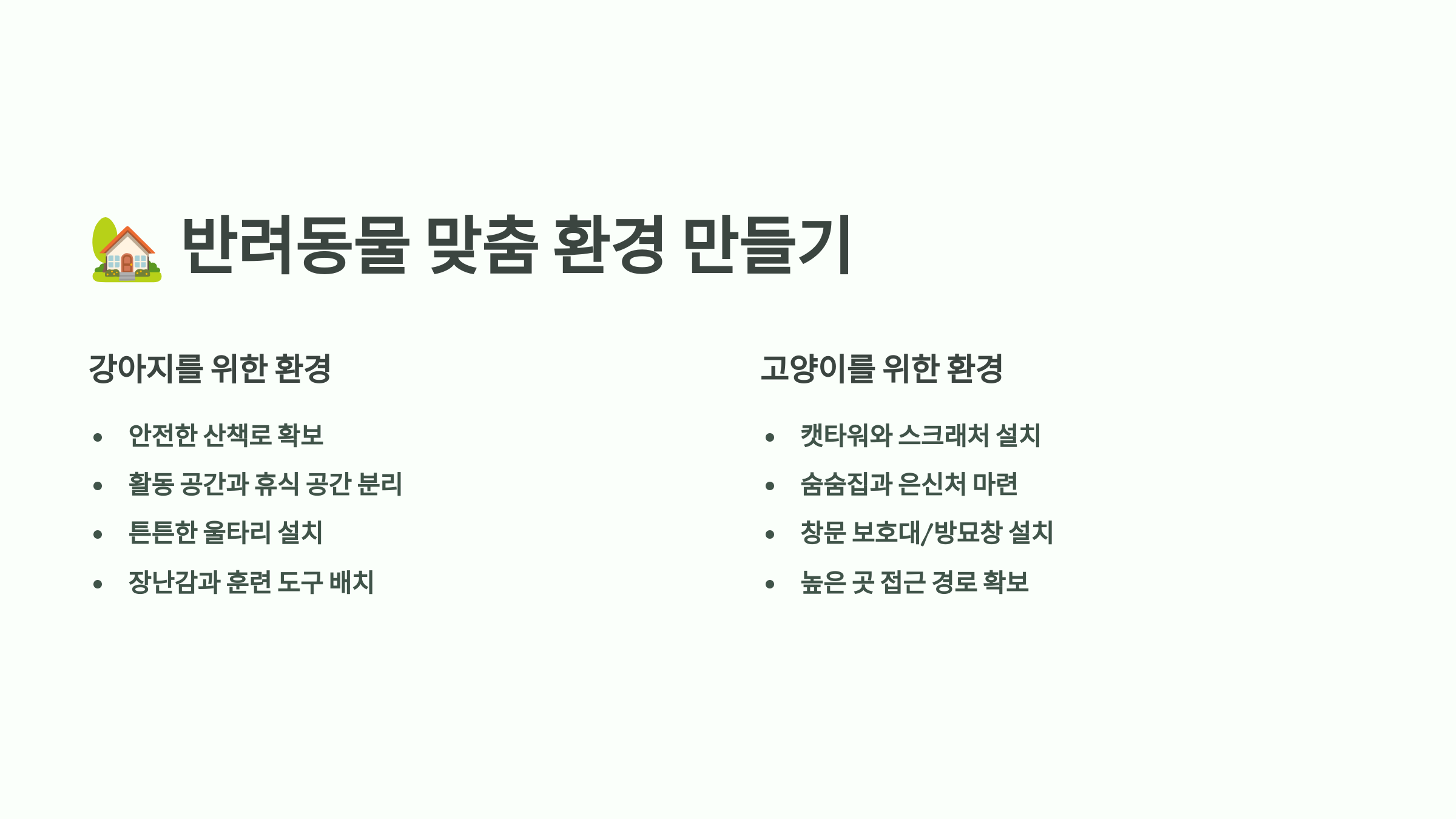다음은 반려동물 맞춤 환경 만들기에 대해 설명해줄게! 🏡✨