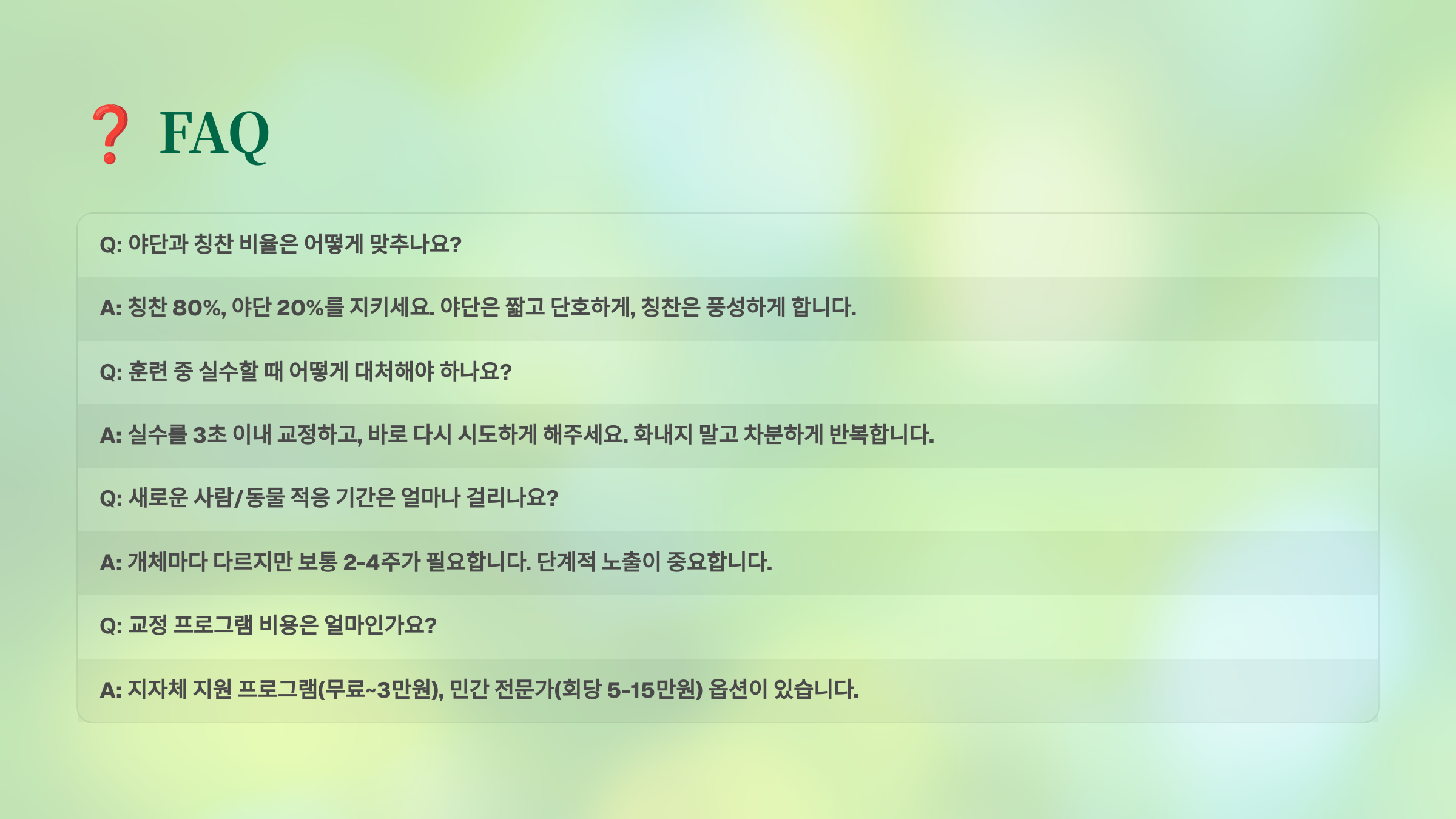 A1. 입양 후 1-2주간은 적응 기간을 가진 뒤 시작하는 게 좋아요. 처음엔 새로운 환경에 적응하느라 스트레스가 높기 때문에, 안정을 찾은 후에 천천히 시작하세요. 단, 심각한 문제행동이 있다면 즉시 전문가 상담을 받는 것이 좋답니다.