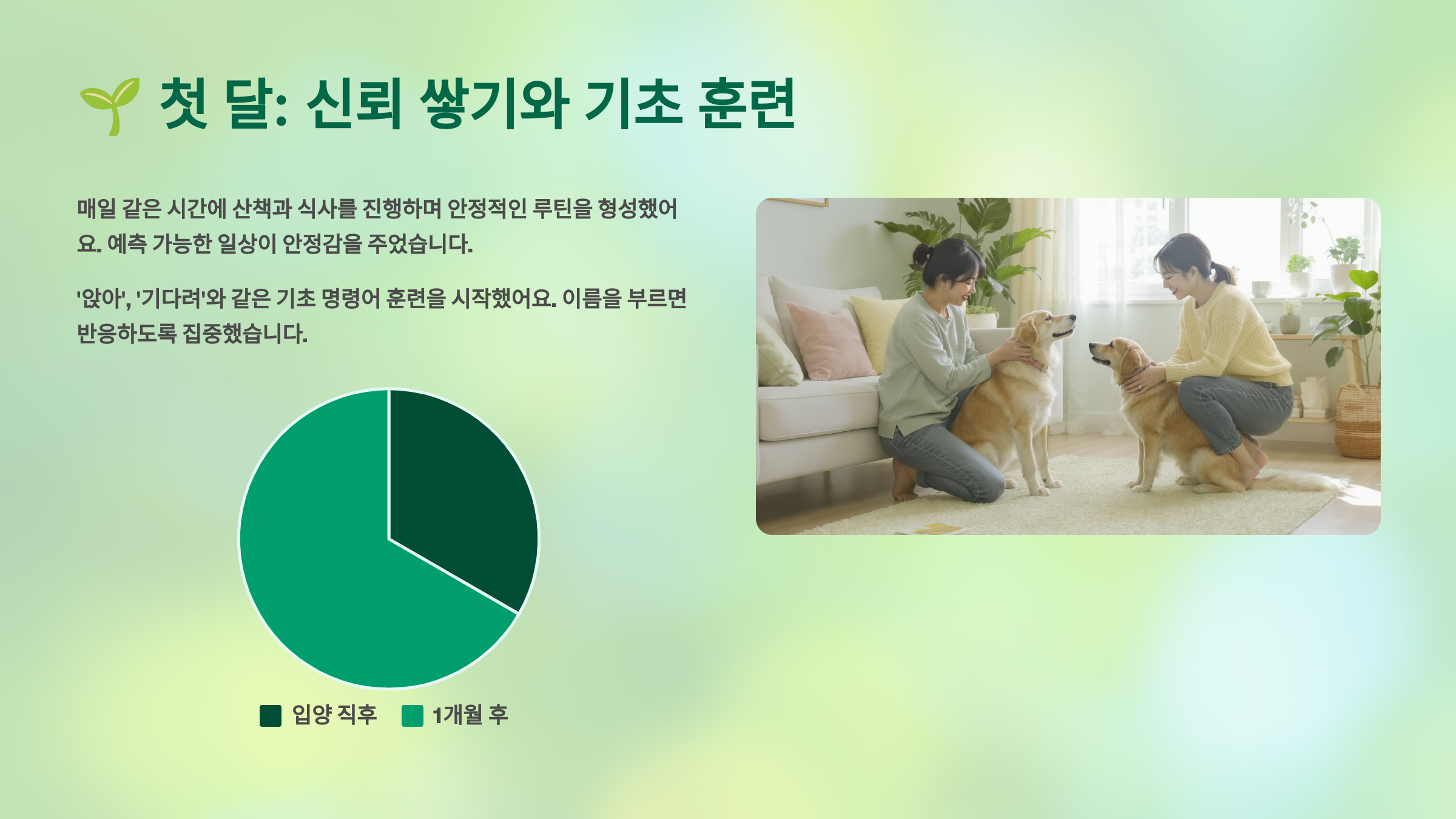 셋째 달에 들어서니 루피는 완전히 다른 개가 되어 있었어요. 불안하고 겁 많던 모습은 사라지고, 자신감 있고 행복한 반려견이 되었죠. 매일 아침 밝은 표정으로 저를 깨우는 루피를 보면 정말 뿌듯했답니다. 이제는 진정한 가족이 된 것 같았어요.