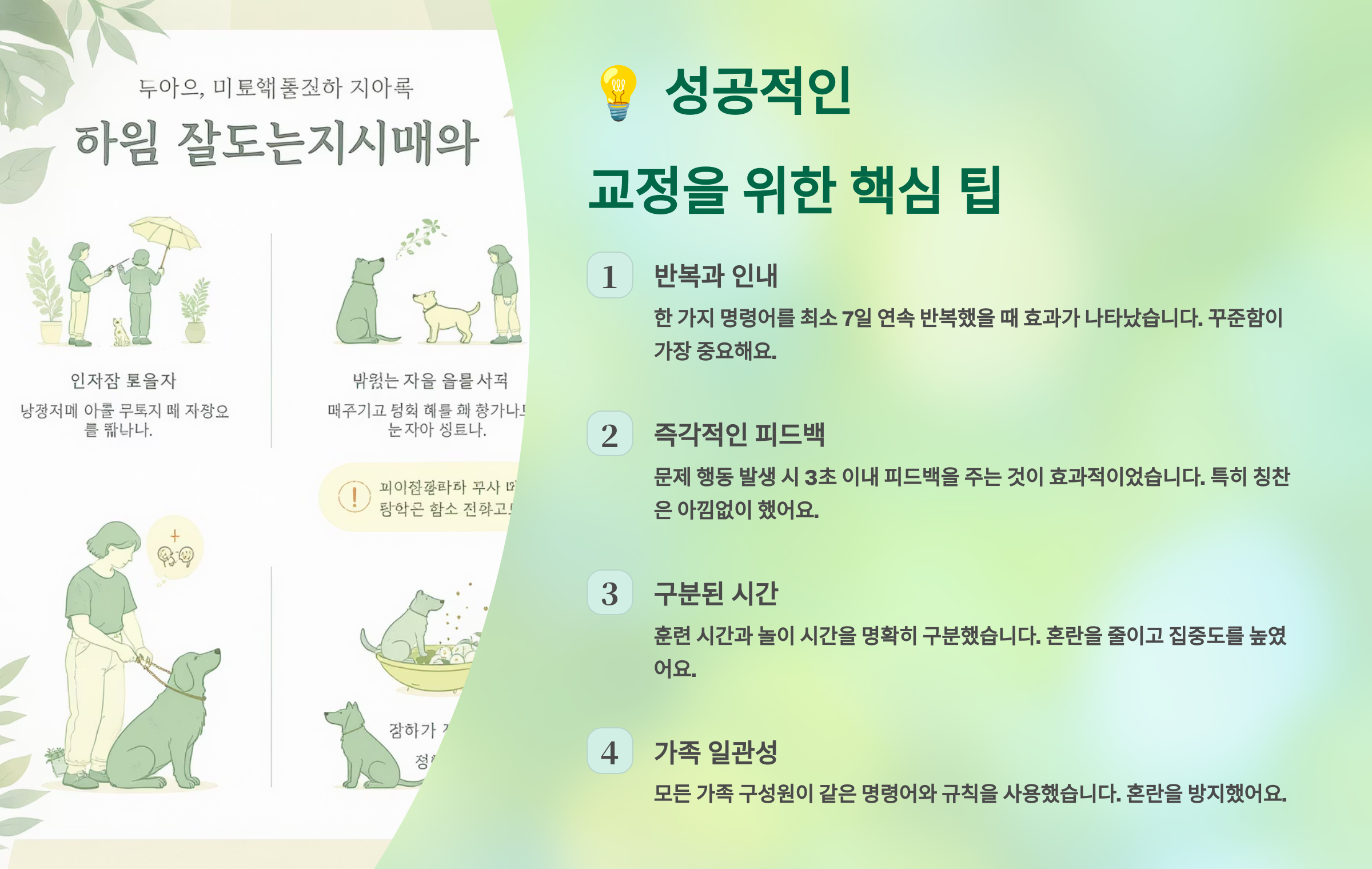 가족의 협조는 정말 중요해요. 한 사람만 노력해서는 효과가 제한적이죠. 가족 모두가 같은 명령어를 사용하고, 같은 규칙을 적용해야 해요. 저희는 냉장고에 훈련 규칙을 적어두고 모두가 볼 수 있도록 했답니다. 주간 가족회의를 통해 진행 상황도 공유했어요.