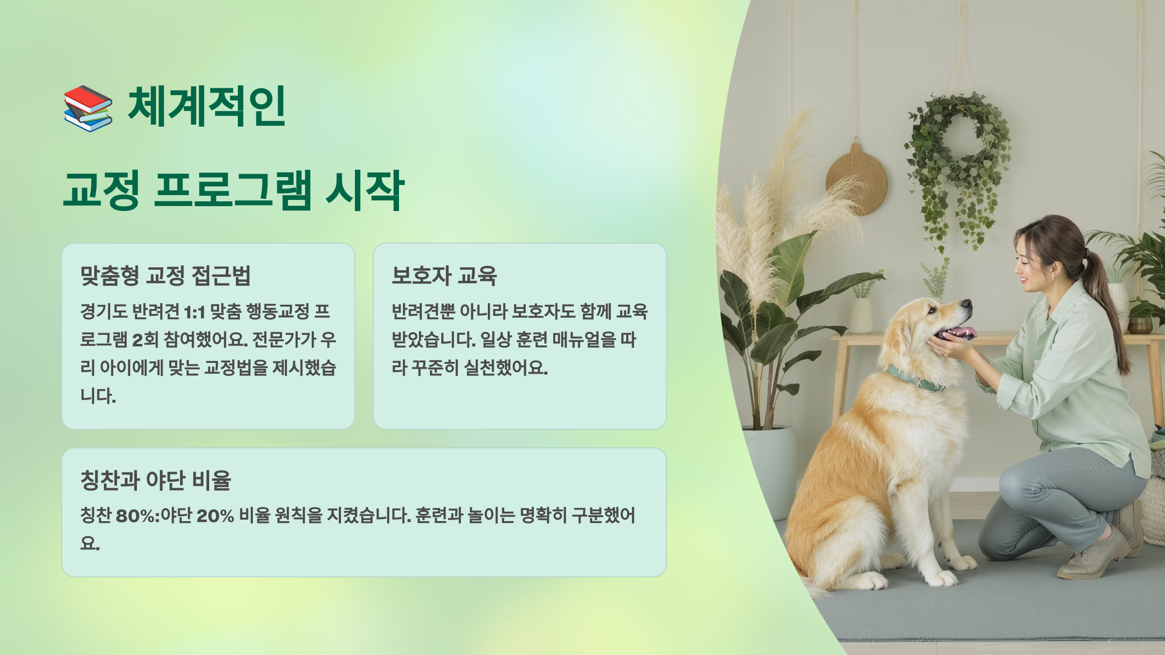 교정 프로그램을 시작한 첫 달은 정말 도전적이었어요. 하지만 작은 변화들이 하나둘 나타나기 시작했죠. 가장 먼저 느낀 변화는 루피의 표정이었어요. 처음의 불안하고 경계하는 눈빛이 점점 부드러워졌답니다. 아침에 일어나면 꼬리를 흔들며 반겨주기 시작했어요.