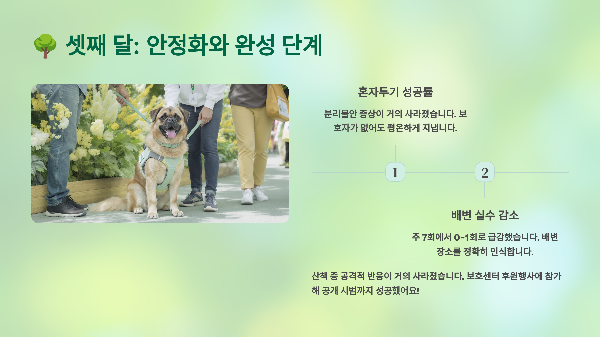 셋째 달에 들어서니 루피는 완전히 다른 개가 되어 있었어요. 불안하고 겁 많던 모습은 사라지고, 자신감 있고 행복한 반려견이 되었죠. 매일 아침 밝은 표정으로 저를 깨우는 루피를 보면 정말 뿌듯했답니다. 이제는 진정한 가족이 된 것 같았어요.