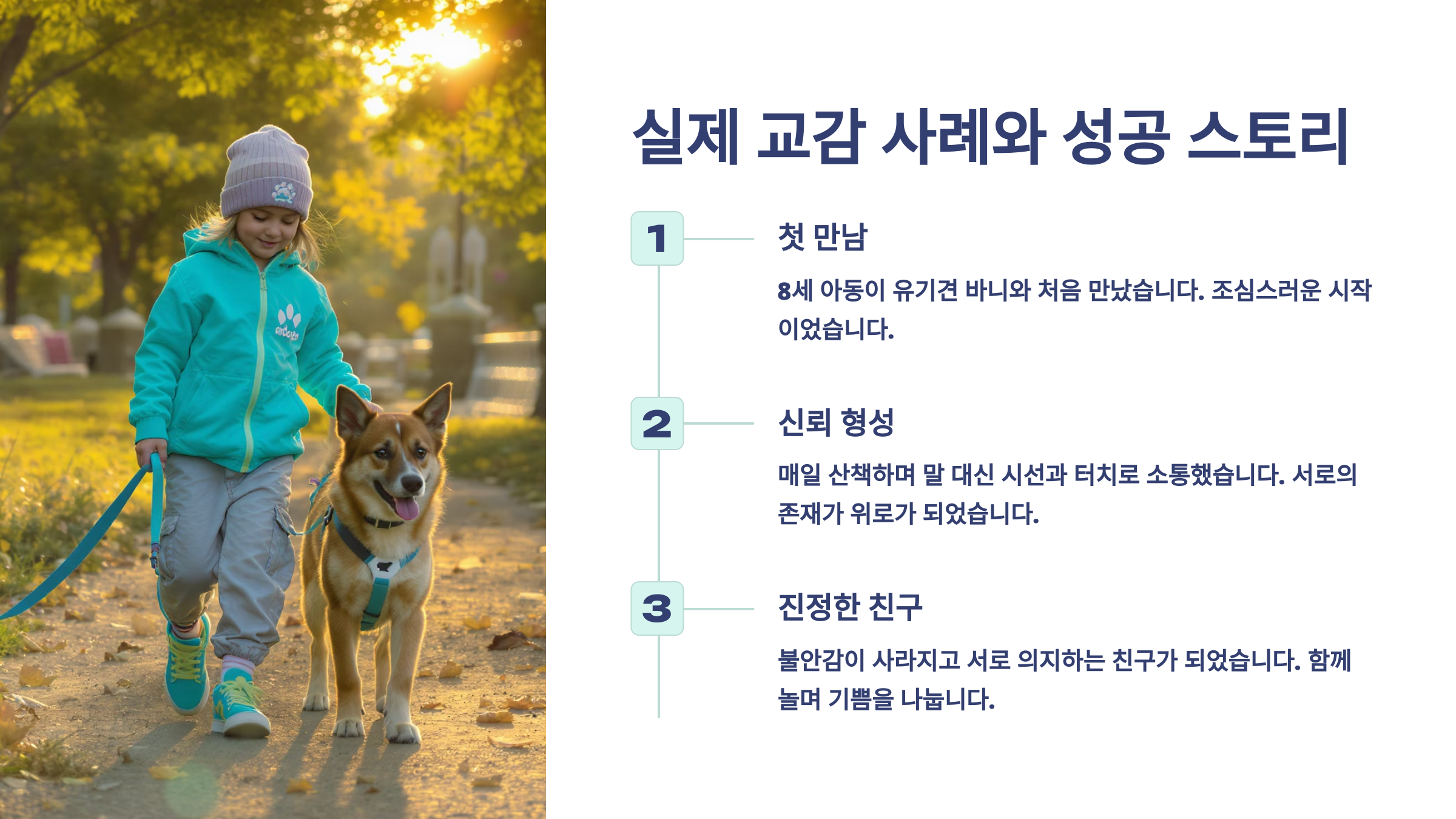 입양동물과 아이의 교감이 특별한 이유는 서로가 서로를 '구해준' 존재라는 인식 때문이에요. 아이는 동물에게 새로운 가족과 사랑을 주었고, 동물은 아이에게 무조건적인 사랑과 위로를 주죠. 이런 상호 관계는 일반적인 반려동물 관계보다 더 깊고 의미 있는 유대감을 만들어낸답니다.
