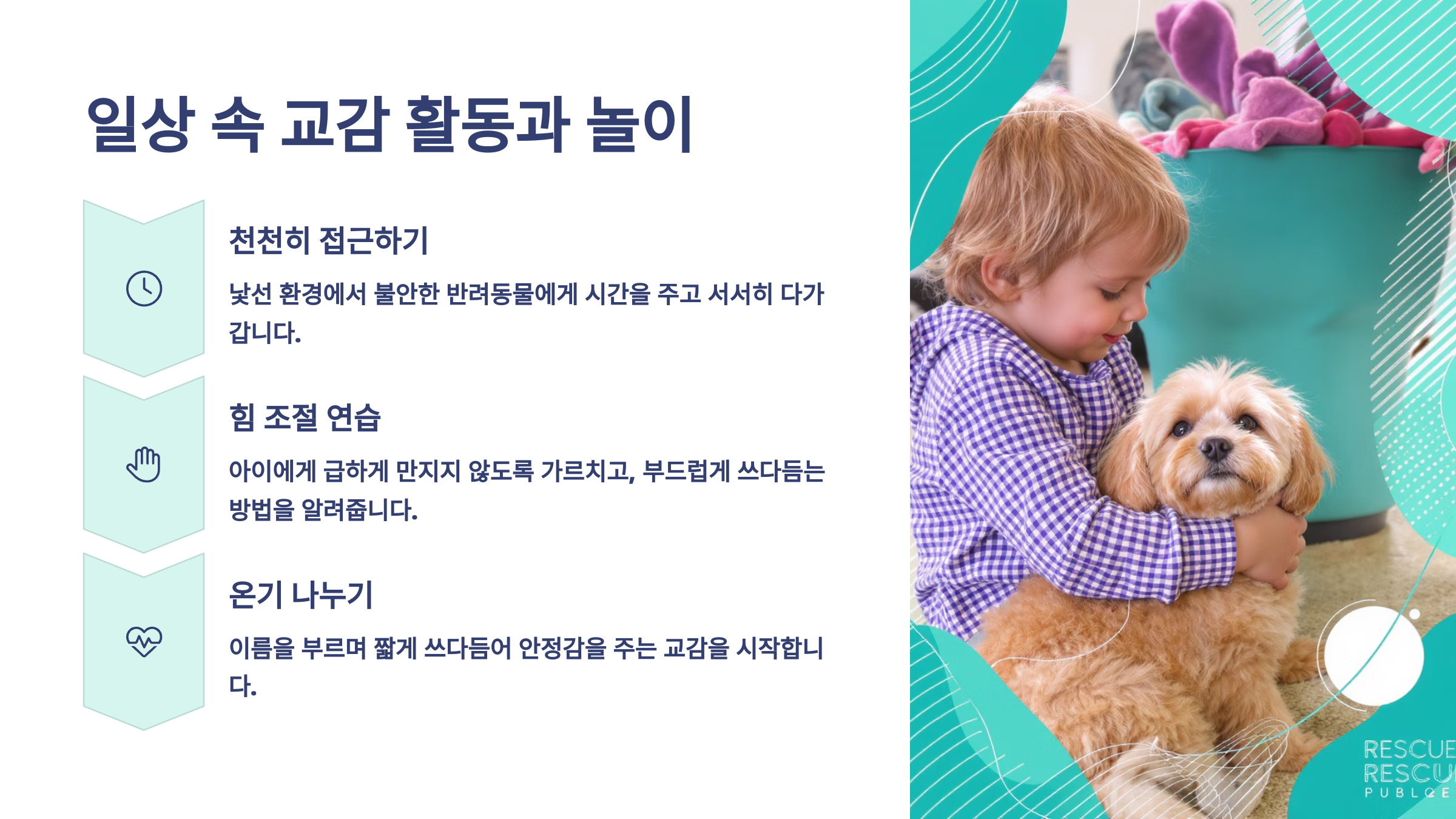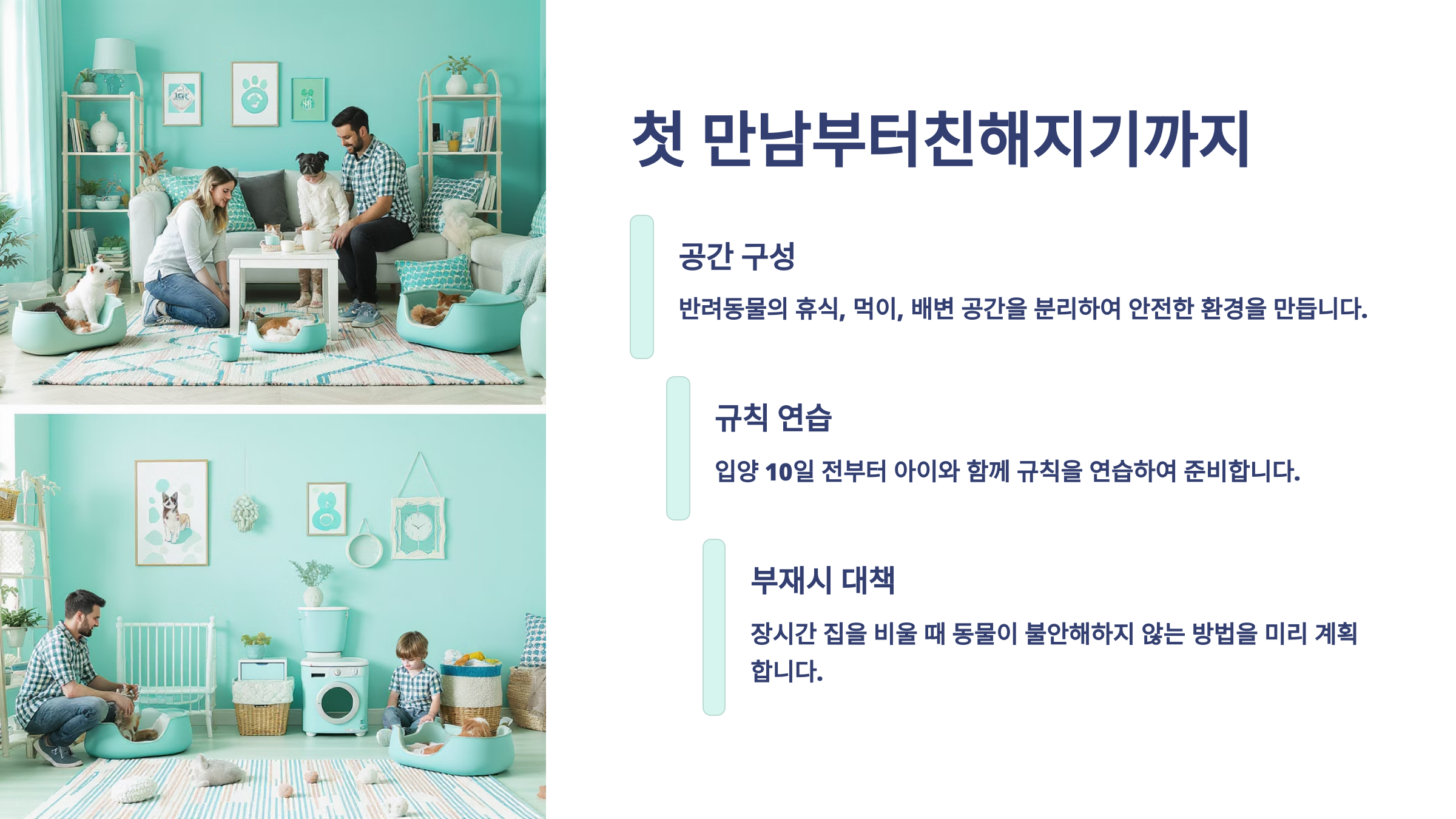 인내심을 갖는 것이 무엇보다 중요해요. 특히 입양동물은 이전의 경험 때문에 사람을 신뢰하는 데 시간이 걸릴 수 있어요. 아이에게도 "우리 새 친구는 시간이 필요해. 천천히 기다려주면 꼭 친해질 거야"라고 설명해주세요. 실제로 많은 경우, 처음에는 경계하던 동물들이 시간이 지나면서 아이와 둘도 없는 친구가 되는 모습을 볼 수 있답니다.
