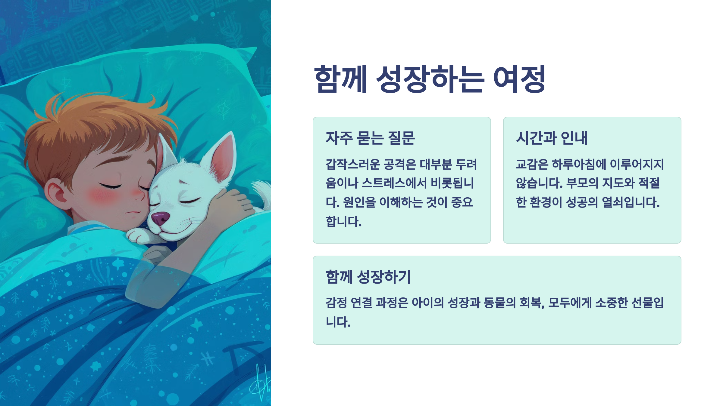입양동물과 아이의 교감이 특별한 이유는 서로가 서로를 '구해준' 존재라는 인식 때문이에요. 아이는 동물에게 새로운 가족과 사랑을 주었고, 동물은 아이에게 무조건적인 사랑과 위로를 주죠. 이런 상호 관계는 일반적인 반려동물 관계보다 더 깊고 의미 있는 유대감을 만들어낸답니다.