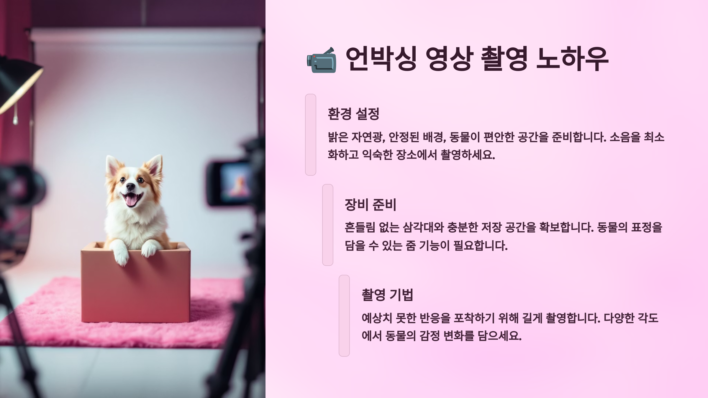 언박싱 영상 촬영은 단순해 보이지만 실제로는 여러 기술적 요소가 필요해요. 먼저 조명이 매우 중요한데, 자연광이 가장 좋지만 실내에서는 부드러운 LED 조명을 활용하는 것이 좋아요. 너무 강한 조명은 동물을 놀라게 할 수 있으니 주의해야 해요.