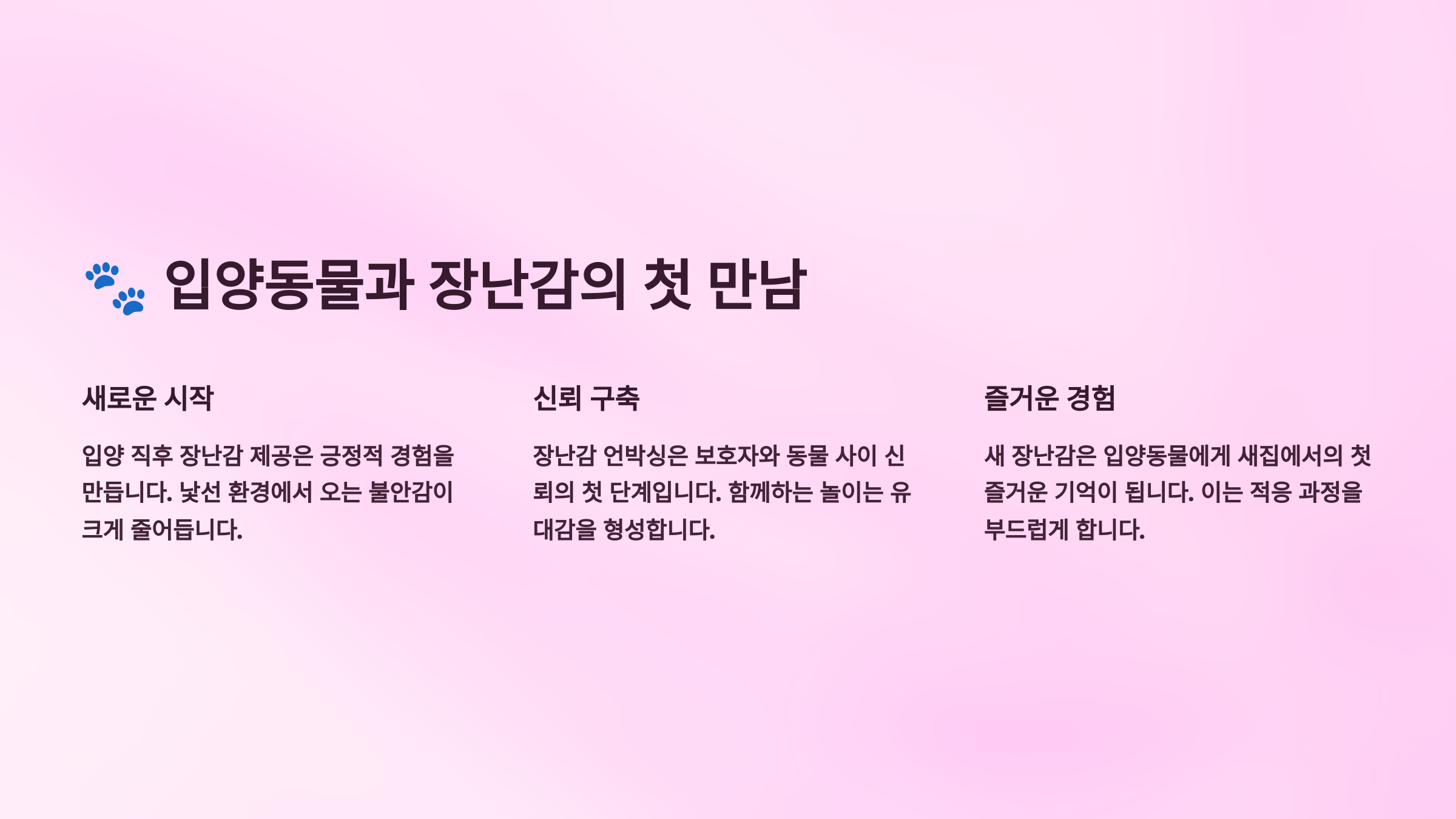 적응기에는 장난감보다 동물의 마음을 읽어주는 것이 더 중요할 수도 있어요. 💝