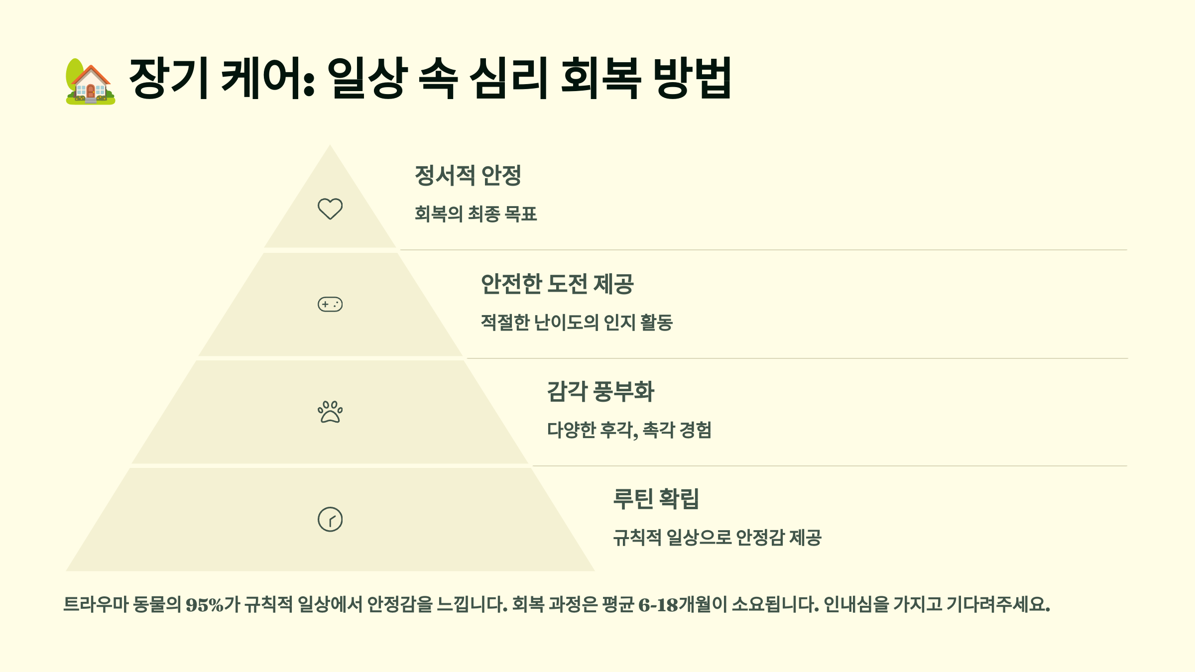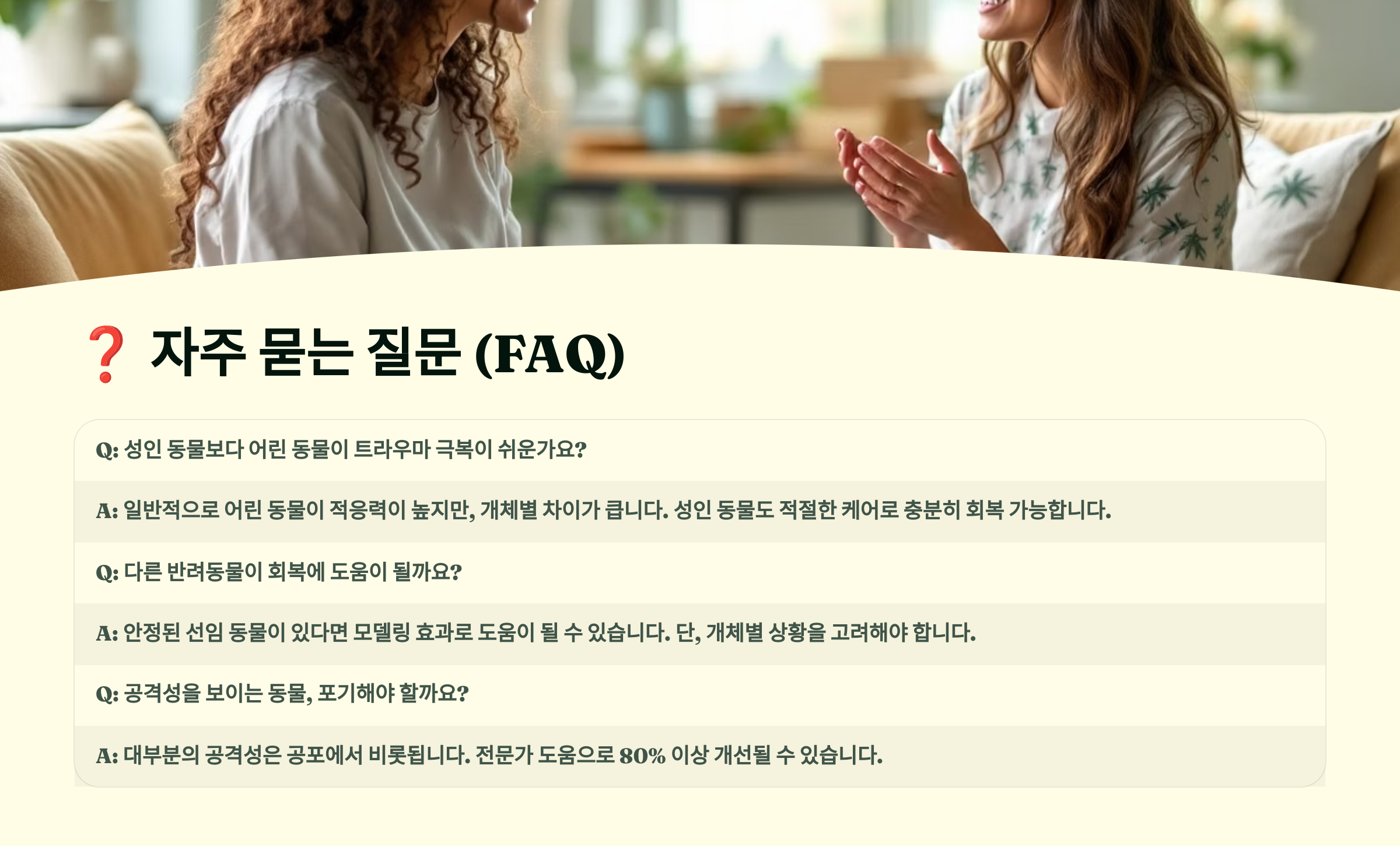 📆 반려동물의 트라우마는 단기간에 사라지지 않아요. 신뢰가 싹트고 유대가 형성돼도, 정서적으로 완전히 회복되려면 오랜 시간과 일상 속 반복적인 안정감이 필요해요.