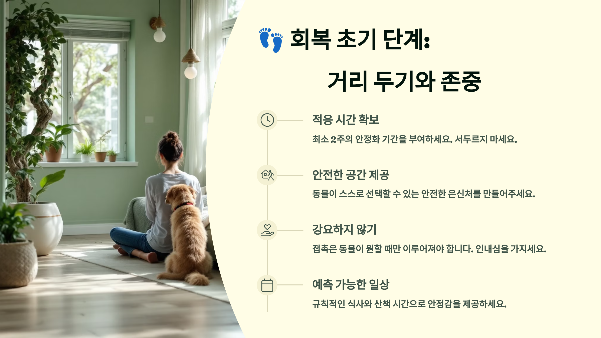 🐾 보호자는 아이와 친해지고 싶은 마음에 말을 걸고, 만지고 싶지만, 트라우마 아이에겐 그것이 또 하나의 침범처럼 느껴질 수 있어요. 이 시기는 오히려 ‘보이지 않는 담장’을 세워주는 게 도움이 돼요.