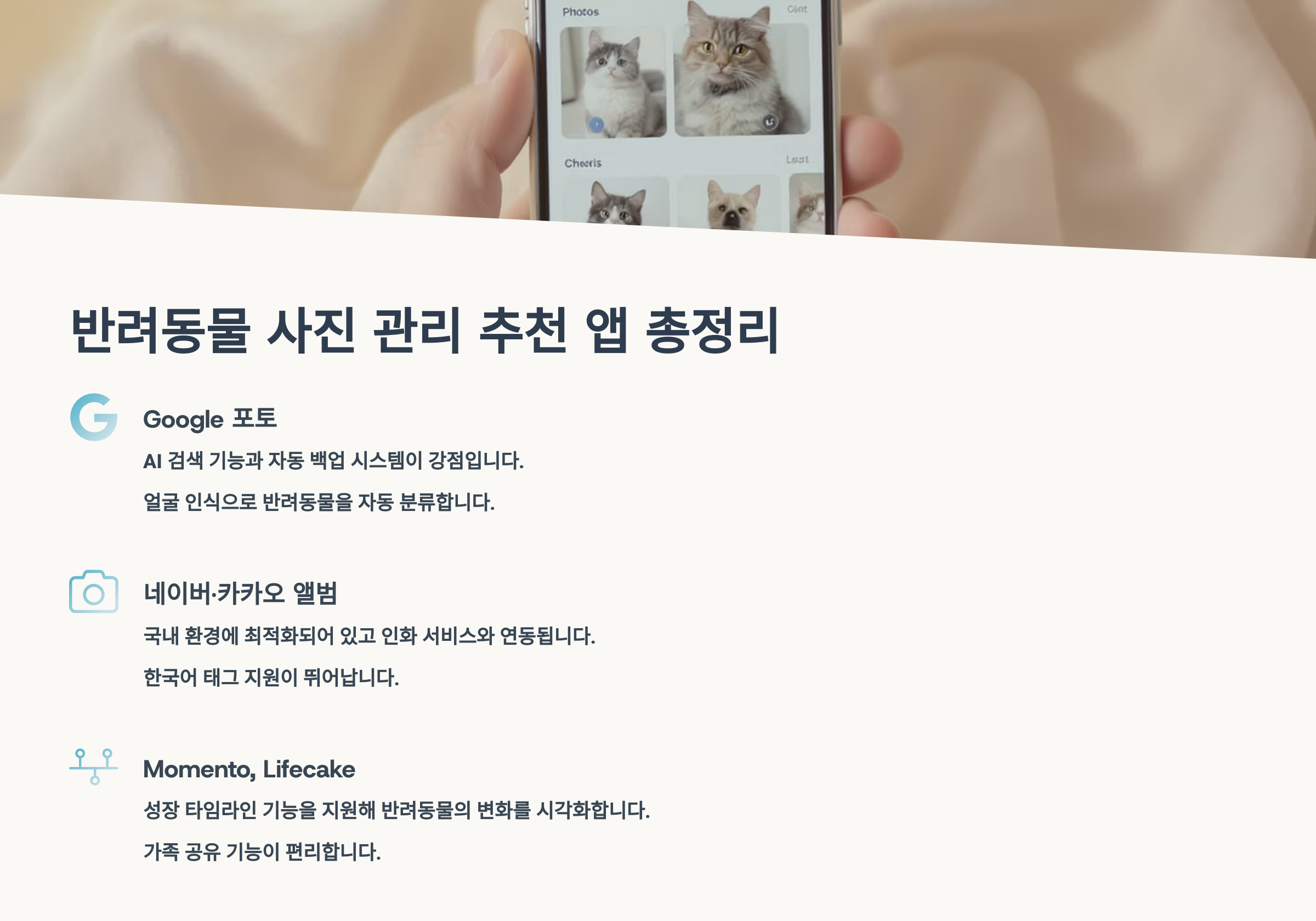 스마트폰 시대에 맞춰 반려동물 사진을 관리하고 사진첩을 만들 수 있는 다양한 앱들이 출시되고 있어요. 각 앱마다 특색 있는 기능들을 제공하고 있어서, 자신의 필요에 맞는 앱을 선택하면 더욱 효율적으로 추억을 관리할 수 있답니다.