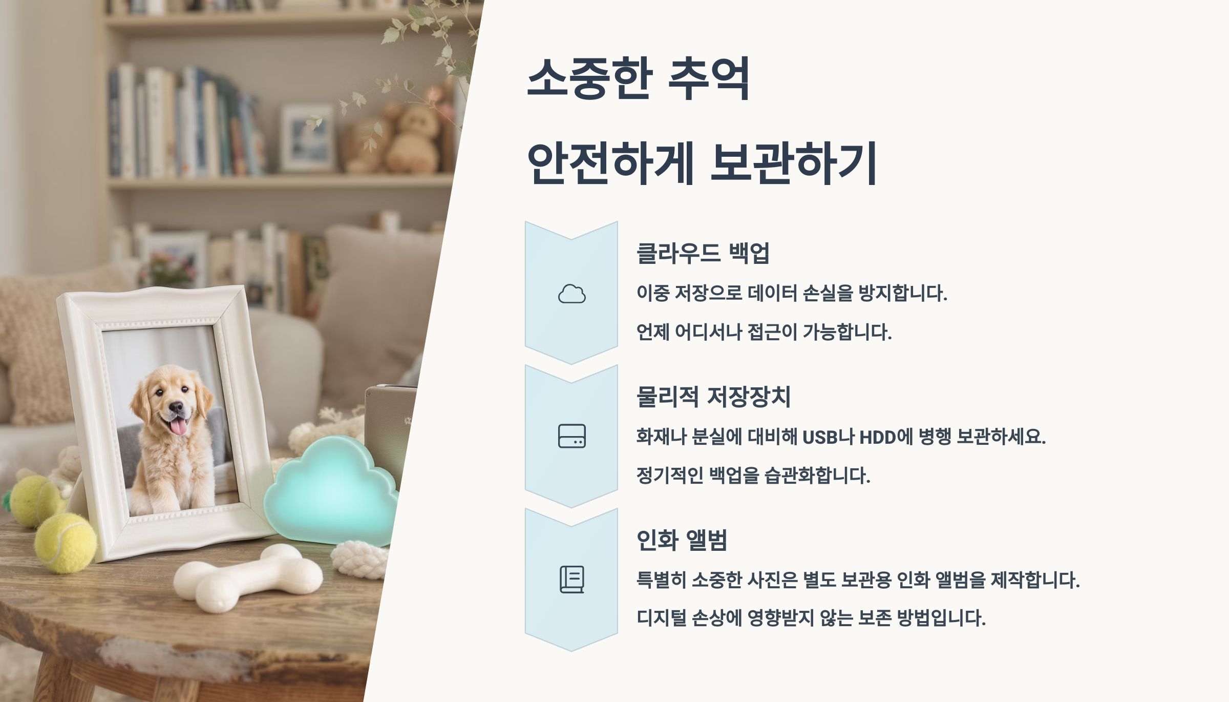 반려동물과의 소중한 추억이 담긴 사진들을 안전하게 보관하는 것은 정말 중요해요. 디지털 시대에는 다양한 방법으로 백업할 수 있지만, 각각의 장단점을 알고 적절히 활용하는 것이 필요하답니다. 여러 방법을 병행하면 더욱 안전하게 보관할 수 있어요.