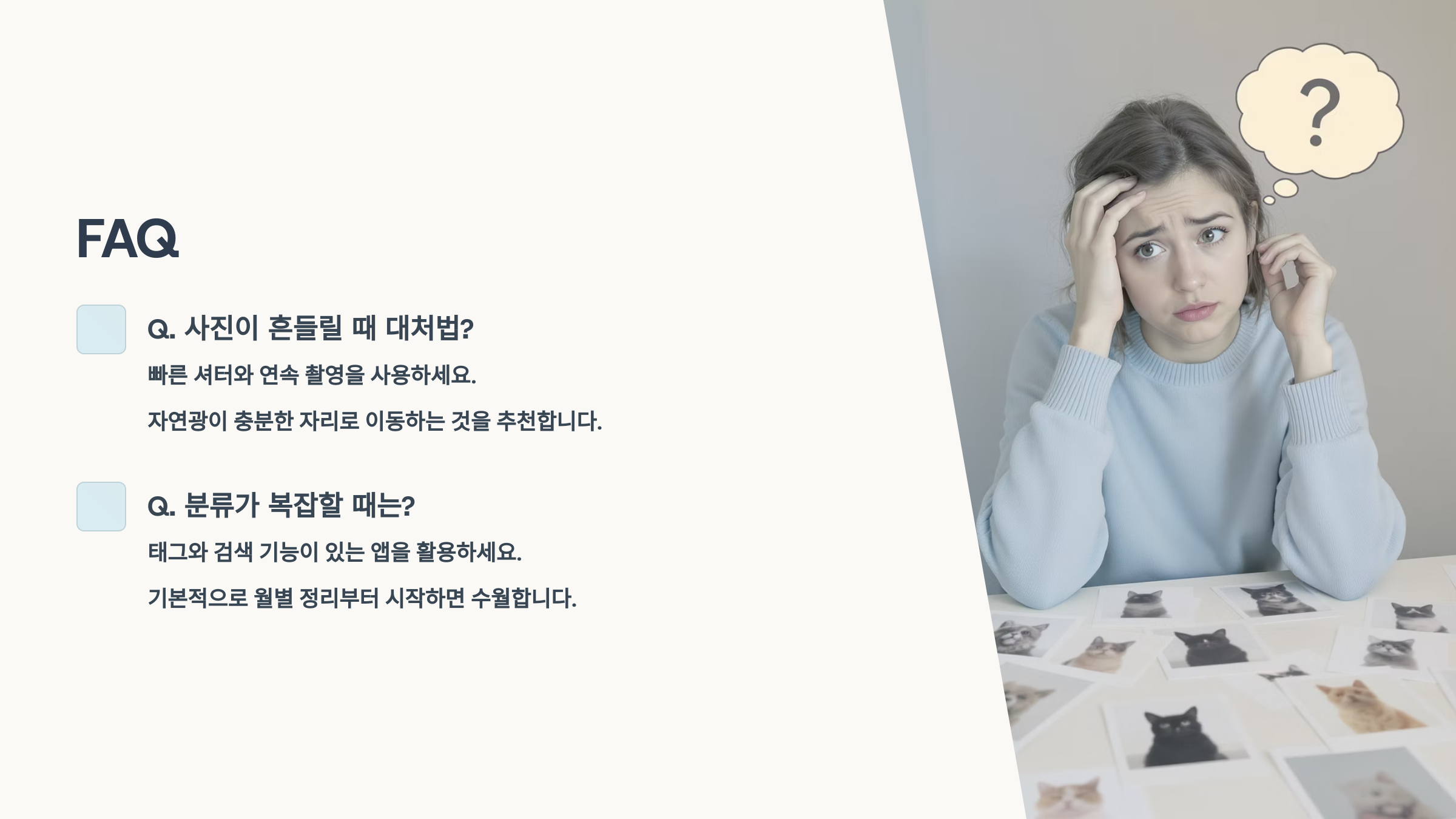 완벽한 사진첩을 만들려고 너무 스트레스받지 마세요. 가장 중요한 것은 반려동물과 함께한 순간들을 소중히 여기는 마음이에요. 흐릿한 사진이라도, 구도가 완벽하지 않아도, 그 안에 담긴 사랑과 추억은 변하지 않으니까요.