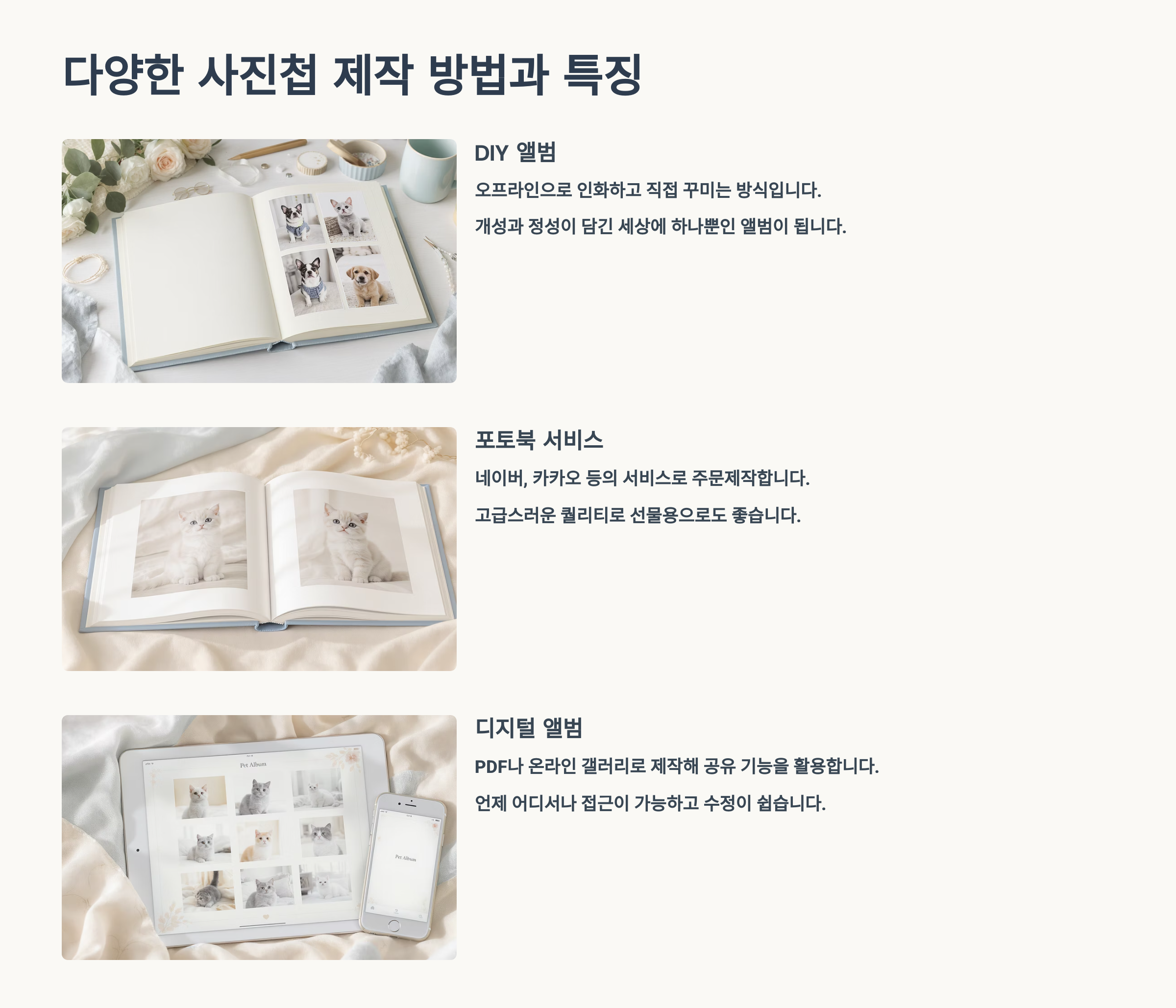 | 디지털 앨범 | 편리한 관리, 공유 용이 | 일상 기록용 |