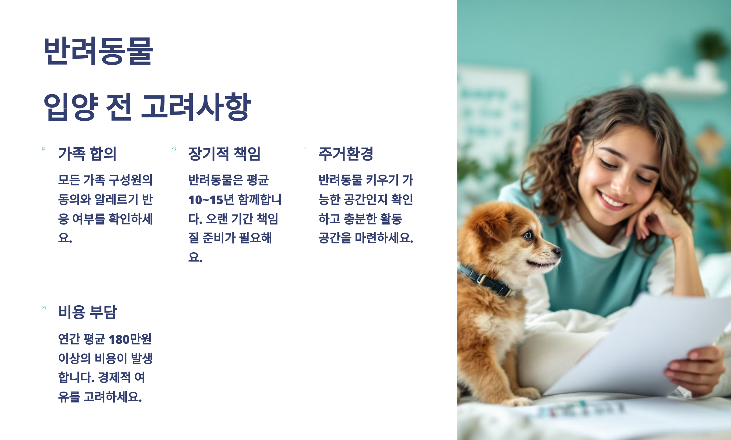 또한 알러지 유무, 이웃과의 소음 문제, 여행이나 출장 시 대리 보호 가능한 사람까지 생각해보면 더 좋아요.