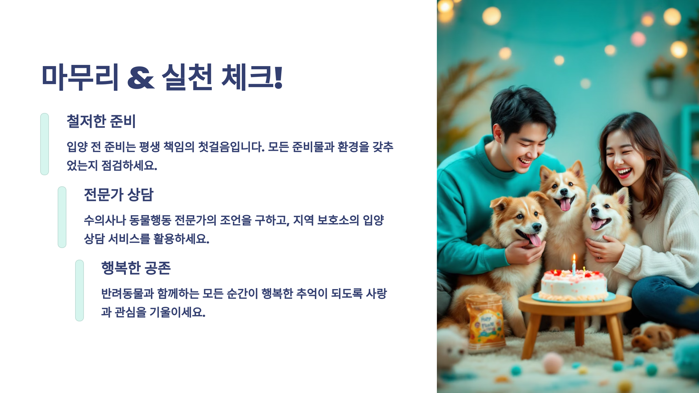 🐶 반려동물 입양은 단순히 '동물 한 마리'를 들이는 게 아니라, 가족 구성원을 한 명 더 맞이하는 일이에요. 그만큼 신중하게 준비하고, 책임감 있게 함께해야 입양 후의 삶도 행복할 수 있죠.
