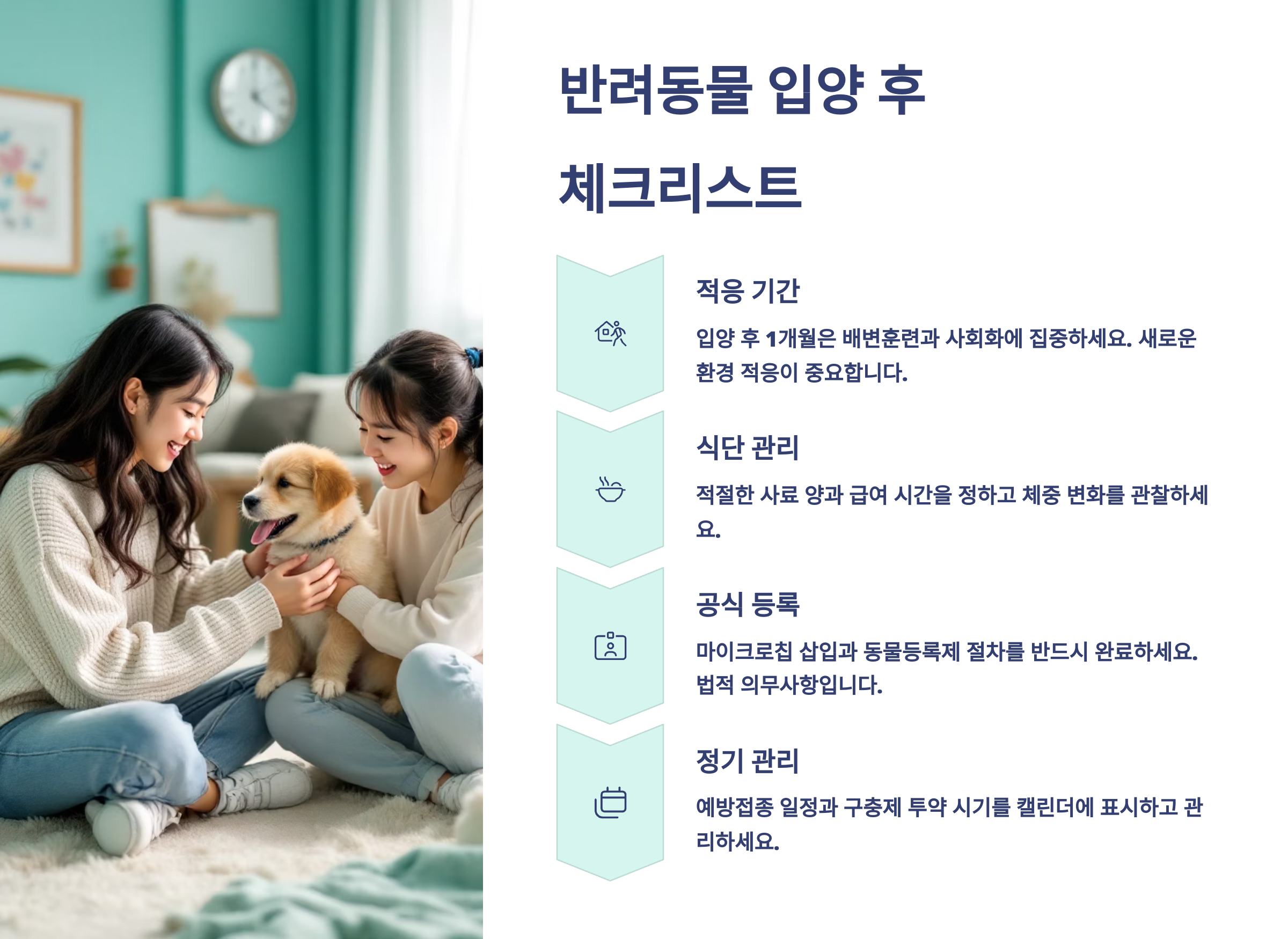 📚 반려동물을 입양한 후에는 시기별로 해야 할 일이 달라져요. 특히 입양 직후 1~2주가 적응과 건강의 관건이기 때문에 타임라인처럼 관리 계획을 세우는 게 좋아요 🗓️