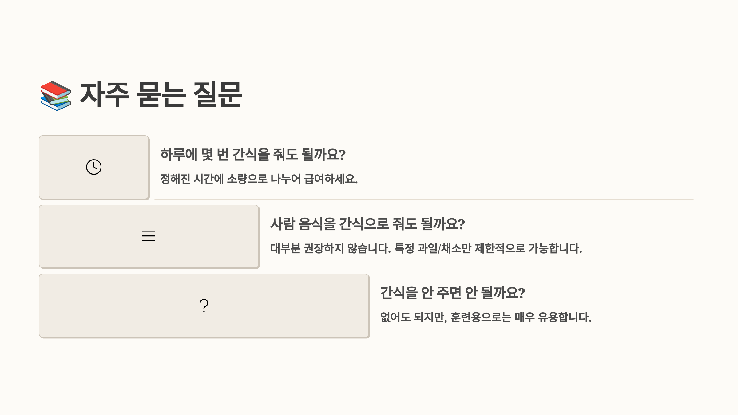 1️⃣ 간식은 ‘보조 식품’일 뿐, 주식이 될 수 없어요.