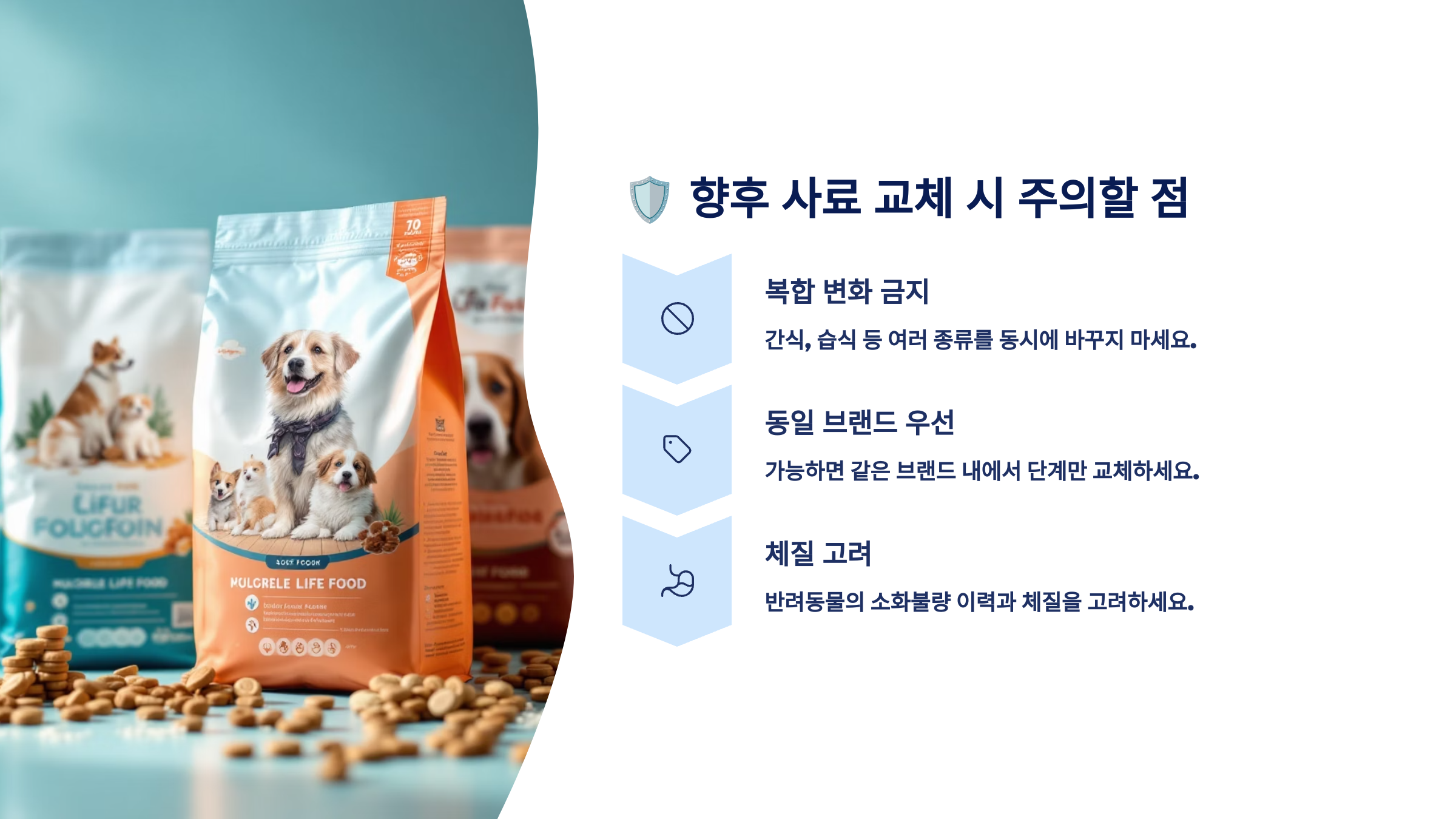 이제 사료 전환이 무서운 게 아니에요! 다음은 앞으로 사료 교체할 때 반드시 기억해야 할 주의사항을 알려드릴게요 🛡️🍽️