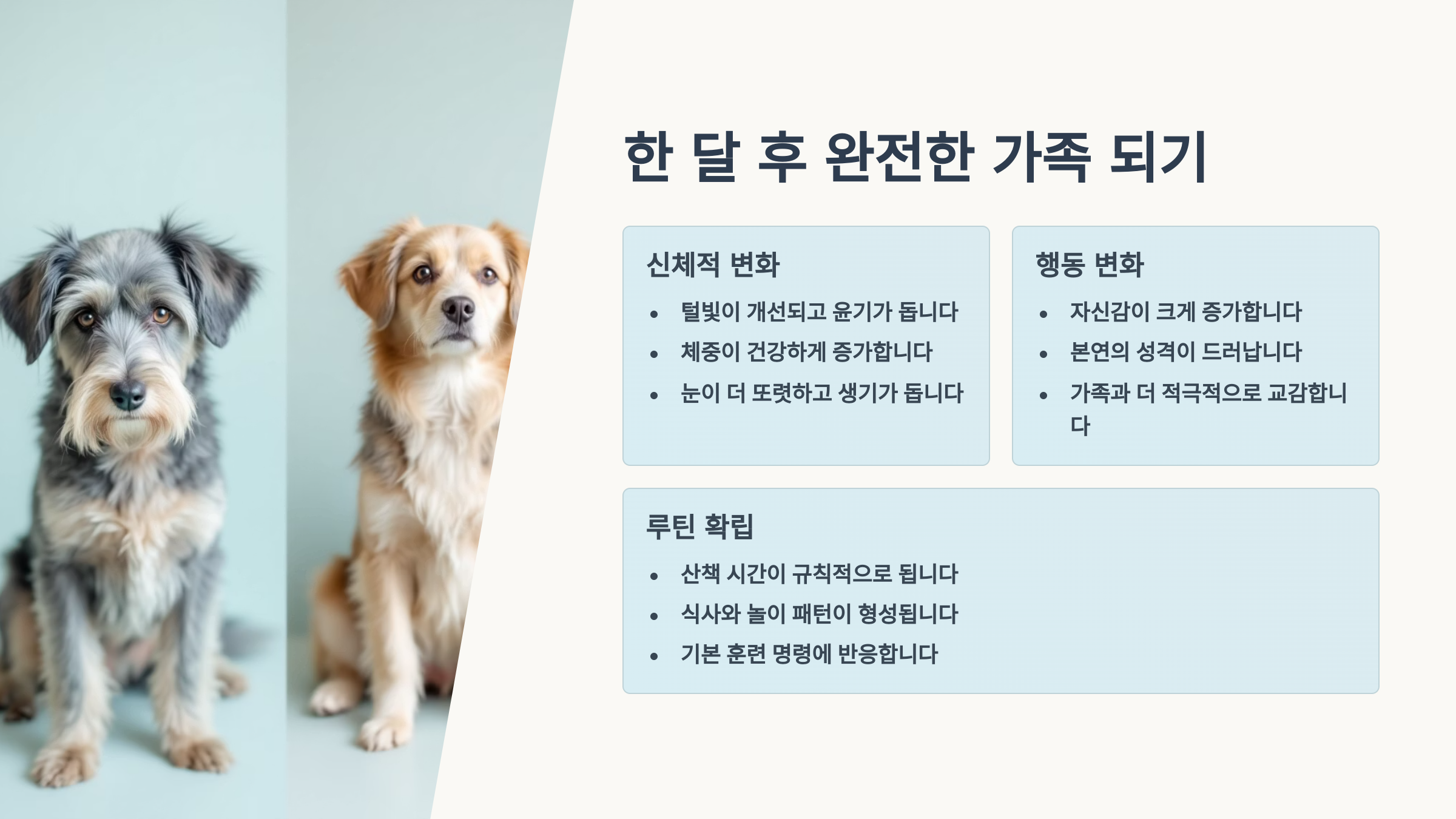 한 달 후의 보리를 보면서 입양의 의미에 대해 다시 한번 생각해보게 되었어요. 단순히 동물을 키우는 것이 아니라 정말 새로운 가족을 맞이하는 것이라는 것을 깨달았어요. 보리가 우리 가족에게 준 것들이 정말 많았는데, 무조건적인 사랑, 매일의 기쁨, 책임감과 성취감 등 말로 표현하기 어려운 소중한 것들이었어요. 또한 보리를 통해 생명의 소중함과 동물에 대한 이해도 깊어졌어요. 한 달간의 브이로그를 마무리하면서 많은 시청자들이 입양에 관심을 가져주시고, 실제로 입양을 결심하셨다는 댓글들을 보면서 정말 뿌듯했어요. 이런 선순환이 계속되어서 더 많은 유기동물들이 따뜻한 가정을 찾을 수 있기를 바라는 마음으로 브이로그를 제작했는데, 그 목적이 어느 정도 달성된 것 같아서 정말 기뻤어요. 앞으로도 보리와의 일상을 계속 공유하면서 반려동물에 대한 인식 개선에 조금이나마 도움이 되고 싶다는 생각을 하게 되었답니다.
