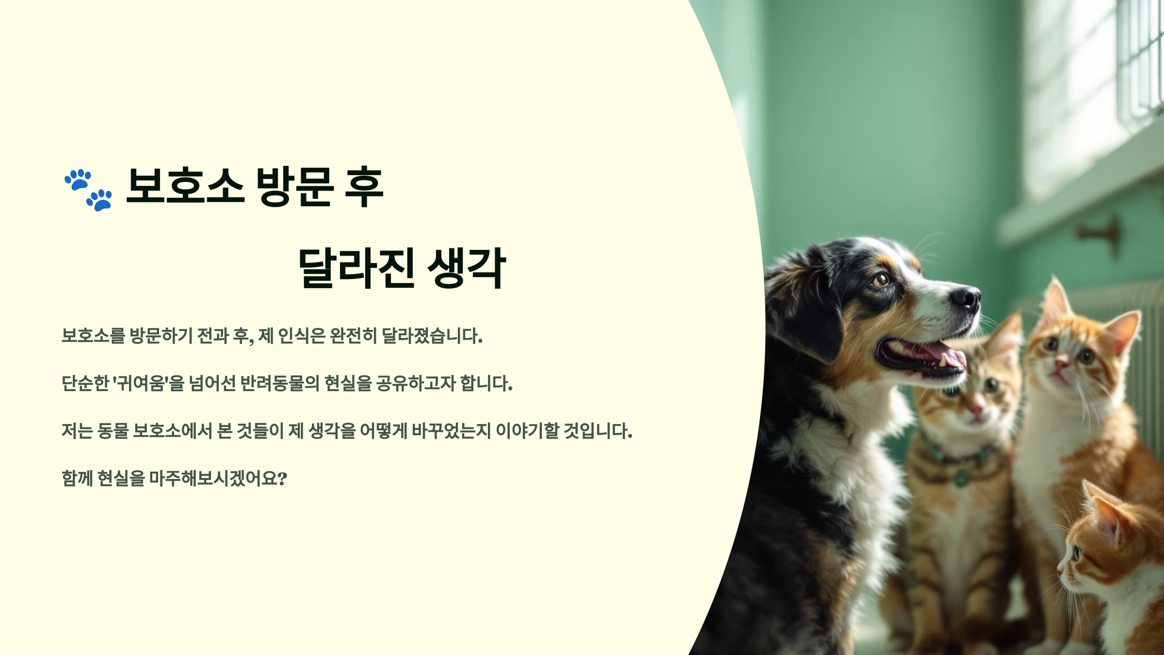 내가 생각했을 때, 보호소를 다녀온다는 건 단순한 봉사활동이 아니라 한 생명 앞에서 나의 책임을 다시 되묻는 시간이었어요. 그리고 그 질문은 지금도 저를 살아가게 하는 힘이 되어주고 있어요.