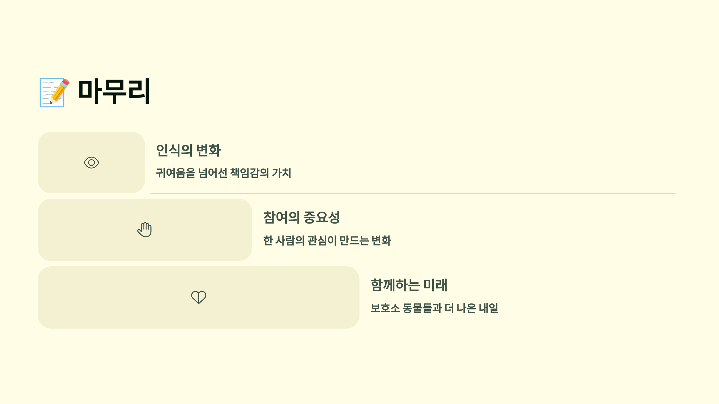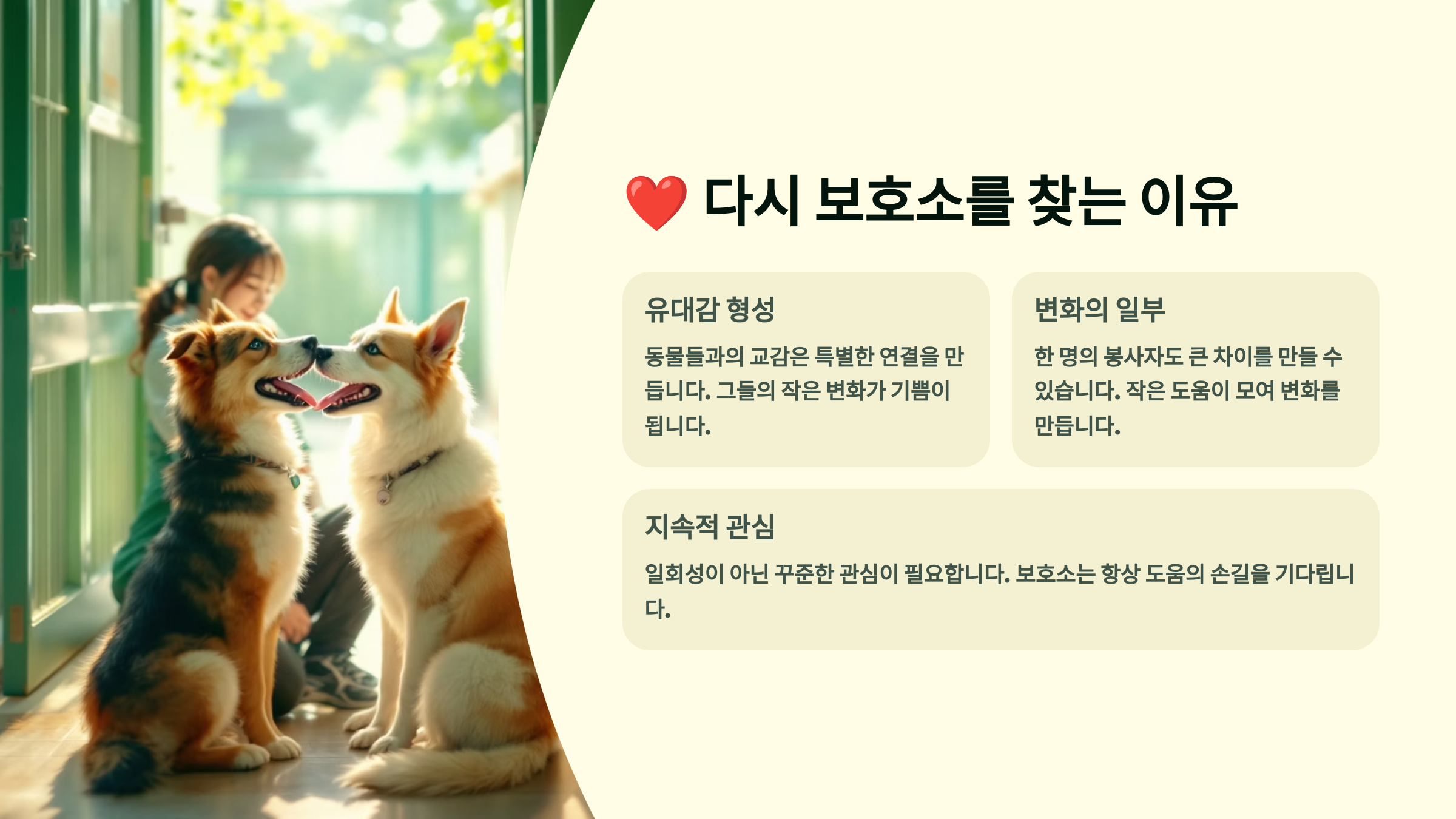 보호소는 동물들의 임시집이자 사람들에게도 큰 질문을 던지는 공간이에요. “우리가 생명을 어떻게 대해야 할까?” 그 질문을 보호소는 매일 우리에게 묻고 있어요.
