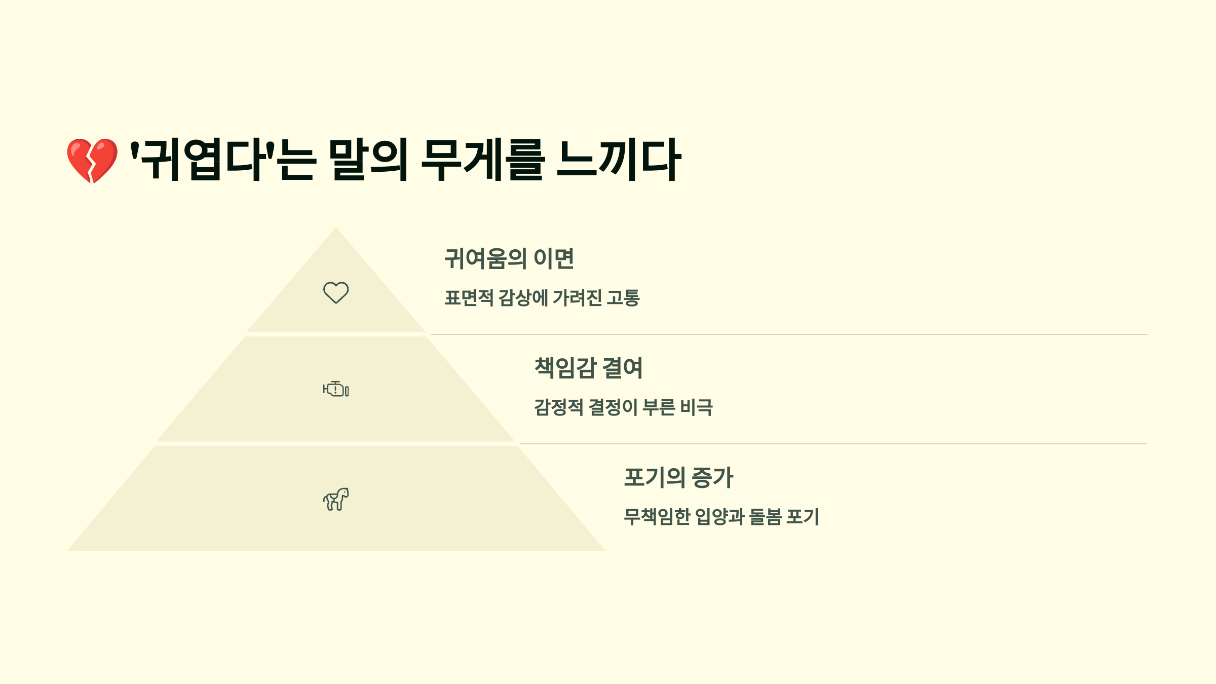 “귀엽다”는 말이 그 생명을 감싸주기엔 너무 가벼운 단어처럼 느껴졌어요. 그때부터 누군가 반려동물을 두고 귀엽다고 말할 때면 그 말 뒤에 ‘책임감’이 함께했으면 좋겠다는 생각이 들기 시작했어요.