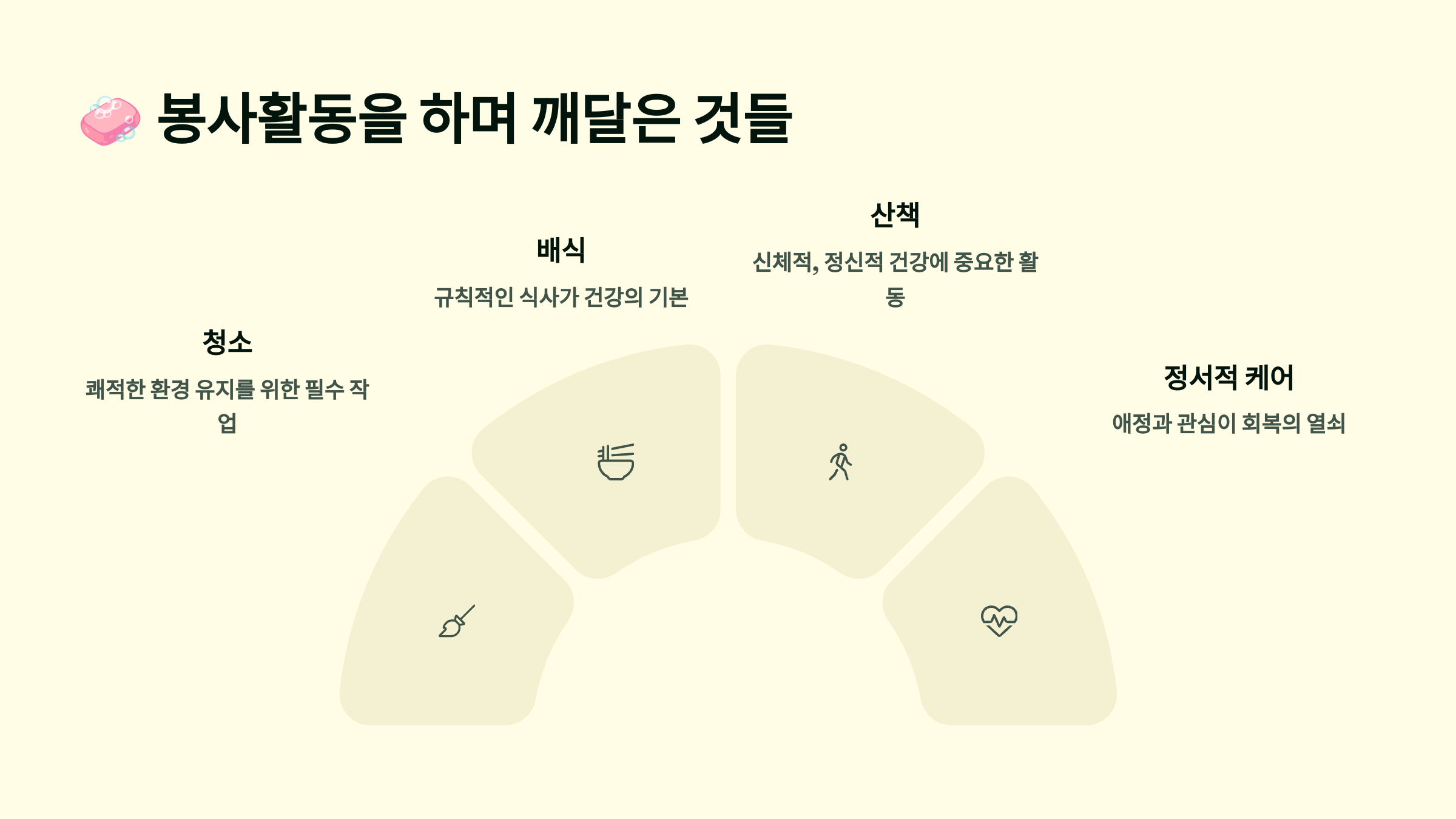 다섯 번째 이야기로 이어가요. 🧼 봉사활동을 하며 깨달은 것들 그 안에서 제가 진짜 많이 배웠어요.