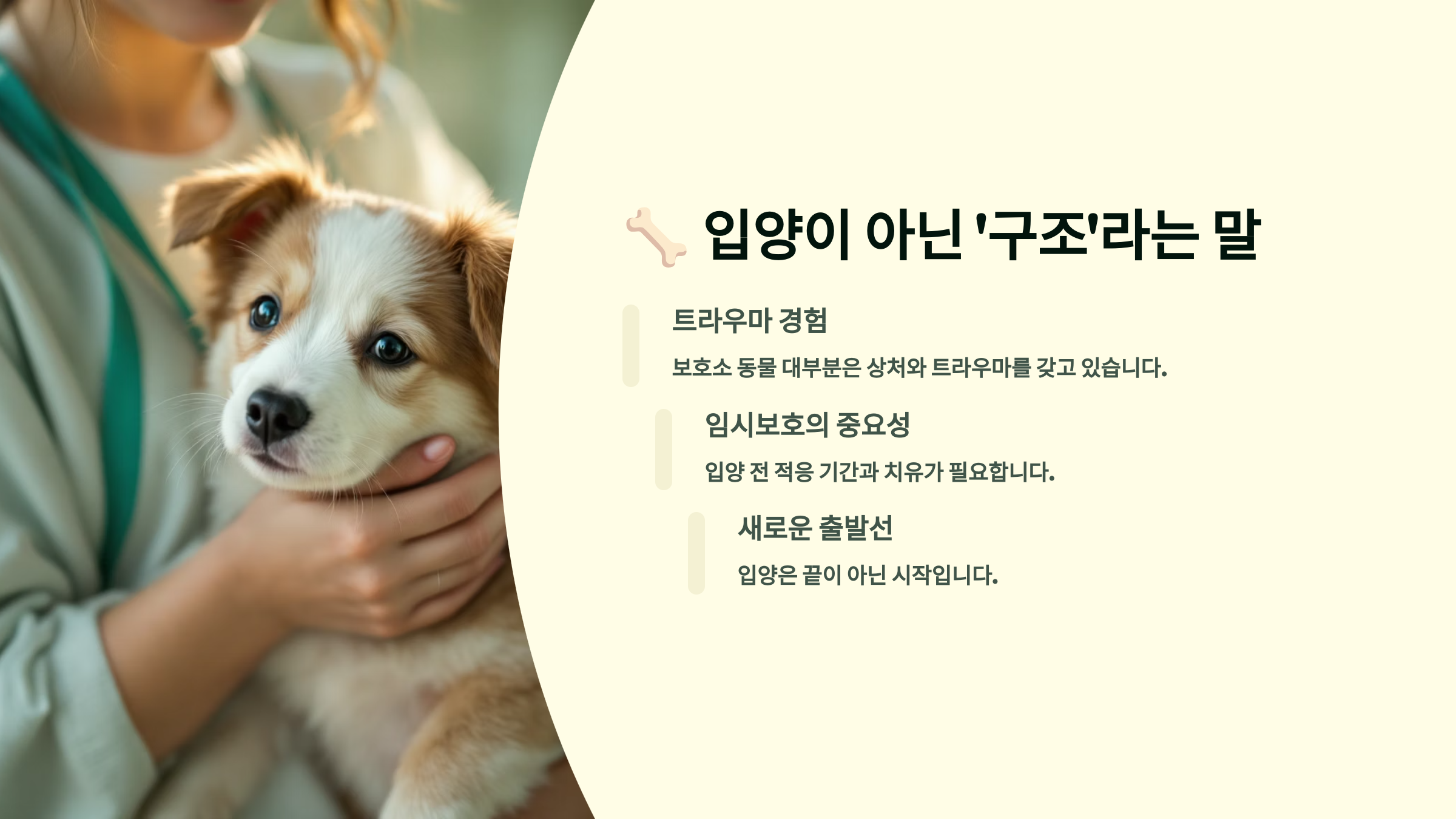 이제 네 번째 이야기, 🦴 입양이 아닌 ‘구조’라는 말로 넘어갈게요. 단어 하나가 바뀌는 순간, 생각도 완전히 달라져요.