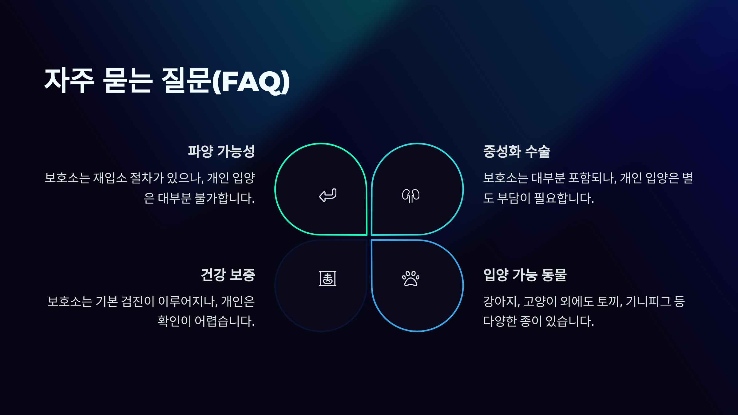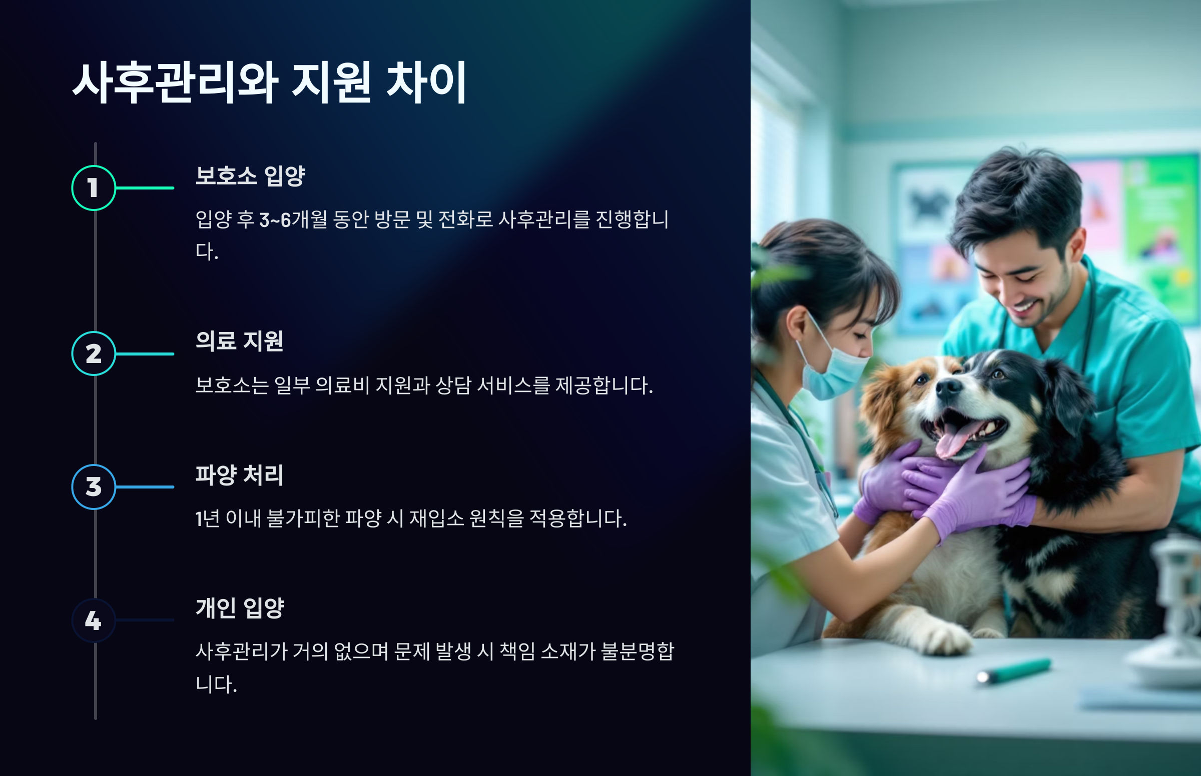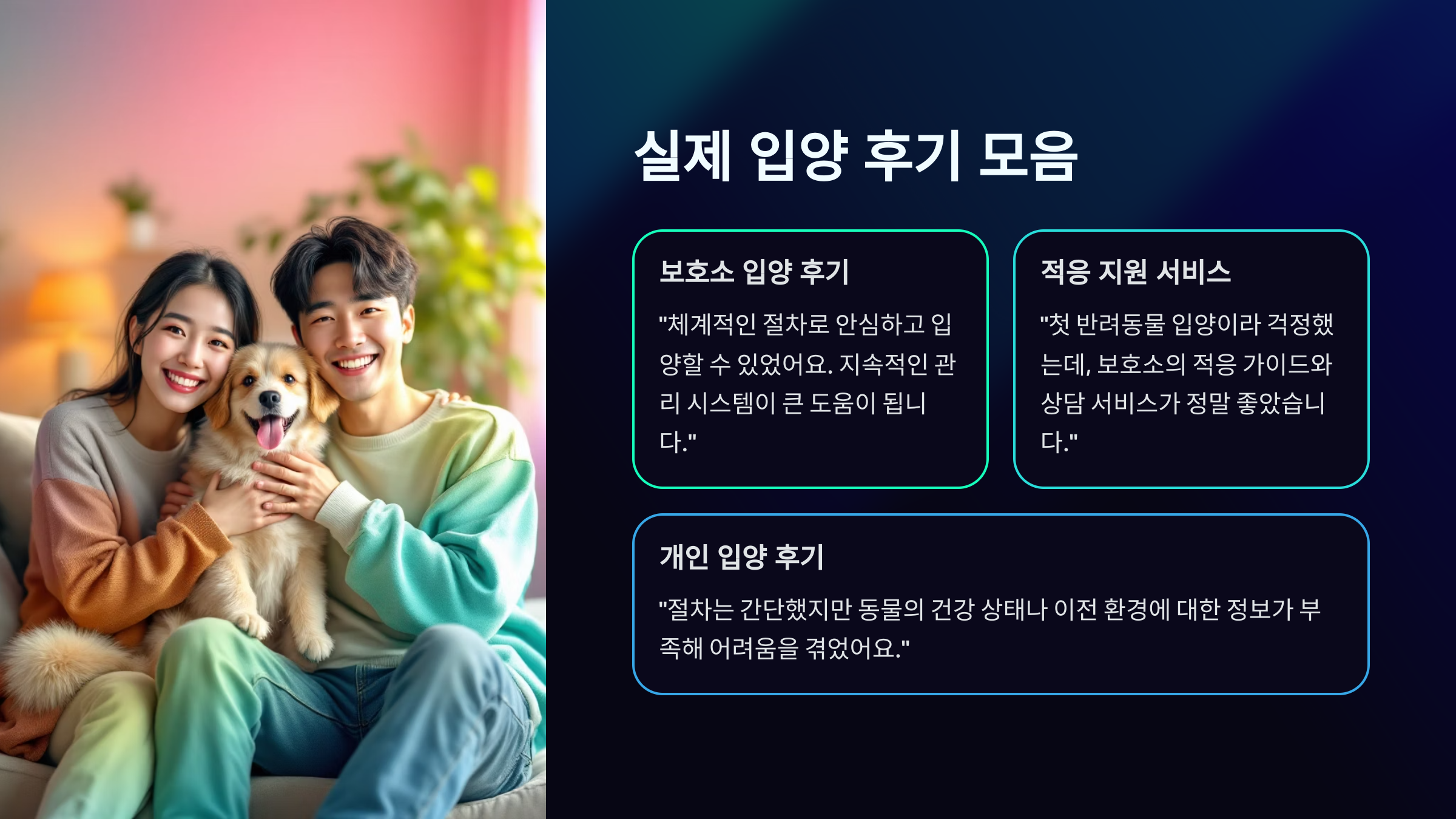 | 개인 입양 | 절차 간단, 빠른 입양 가능 | 정보 부족, 병원비 추가 가능성 |