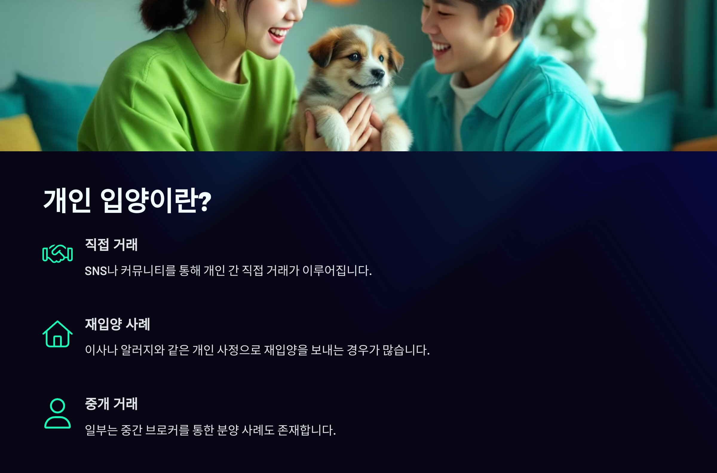 개인 입양의 가장 큰 특징은 조건이 보호소보다 느슨하거나 아예 없는 경우도 있다는 것. 빠르게 입양이 가능하지만, 검증된 절차나 보호 기관의 중재가 없기 때문에 문제가 생겼을 때 보호받기 어렵다는 단점도 있어요. ❗