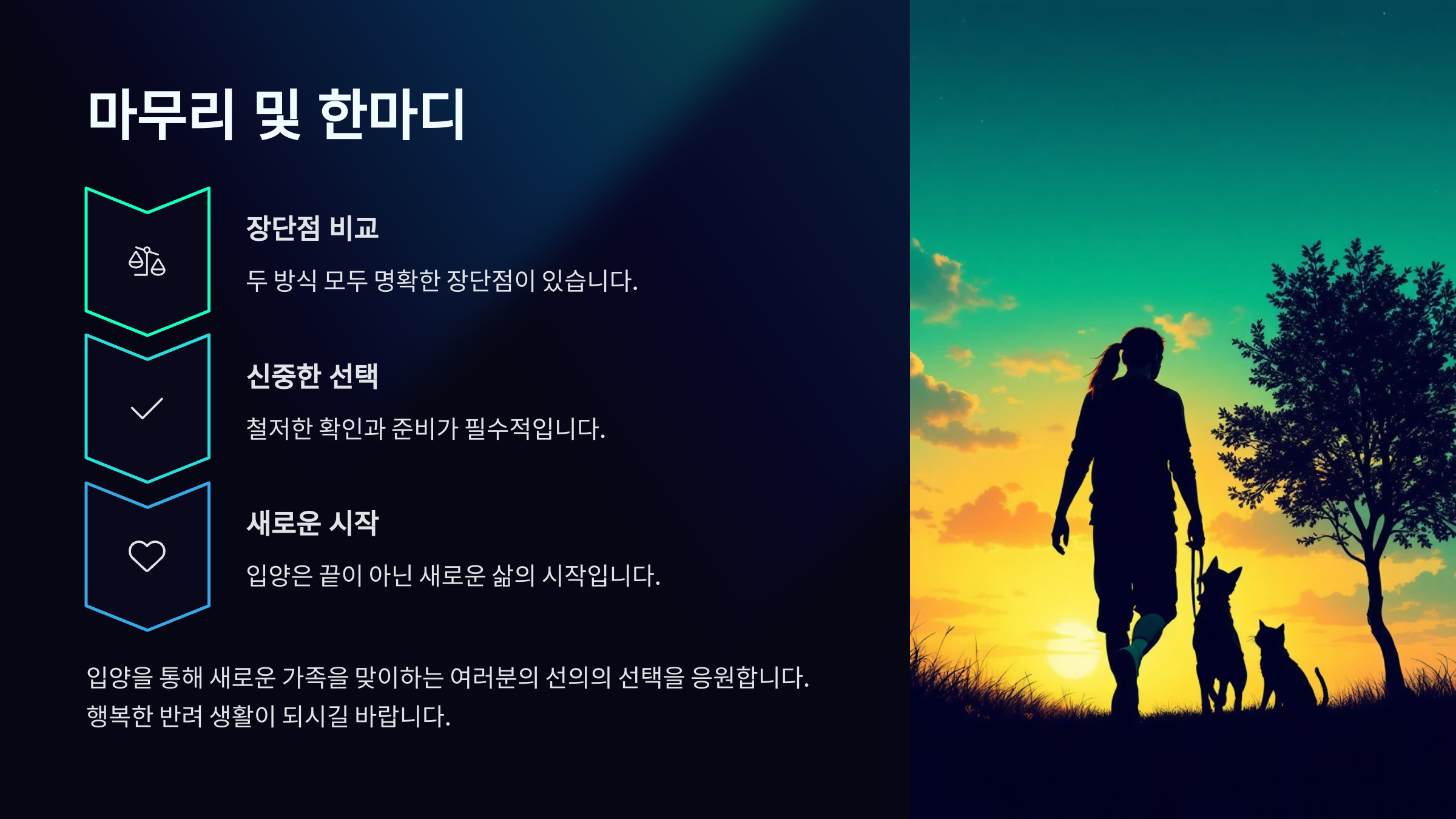 내가 생각했을 때 이 모든 비교는 결국 내가 얼마나 준비되어 있고, 끝까지 책임질 마음이 있는가에 따라 달라져요. 어떤 입양 방식이든, 반려동물에게는 오직 하나뿐인 가족이 되니까요. ❤️