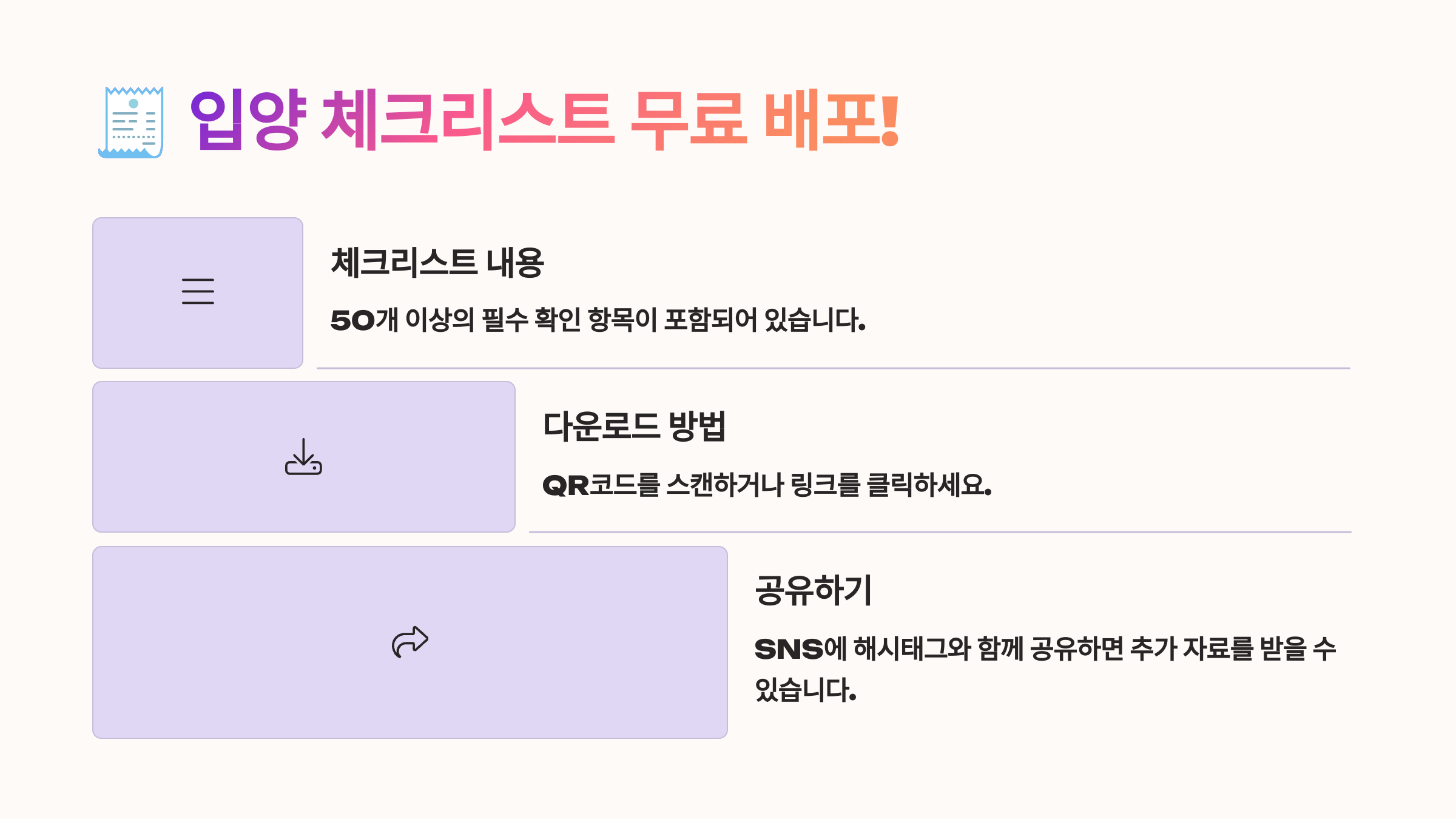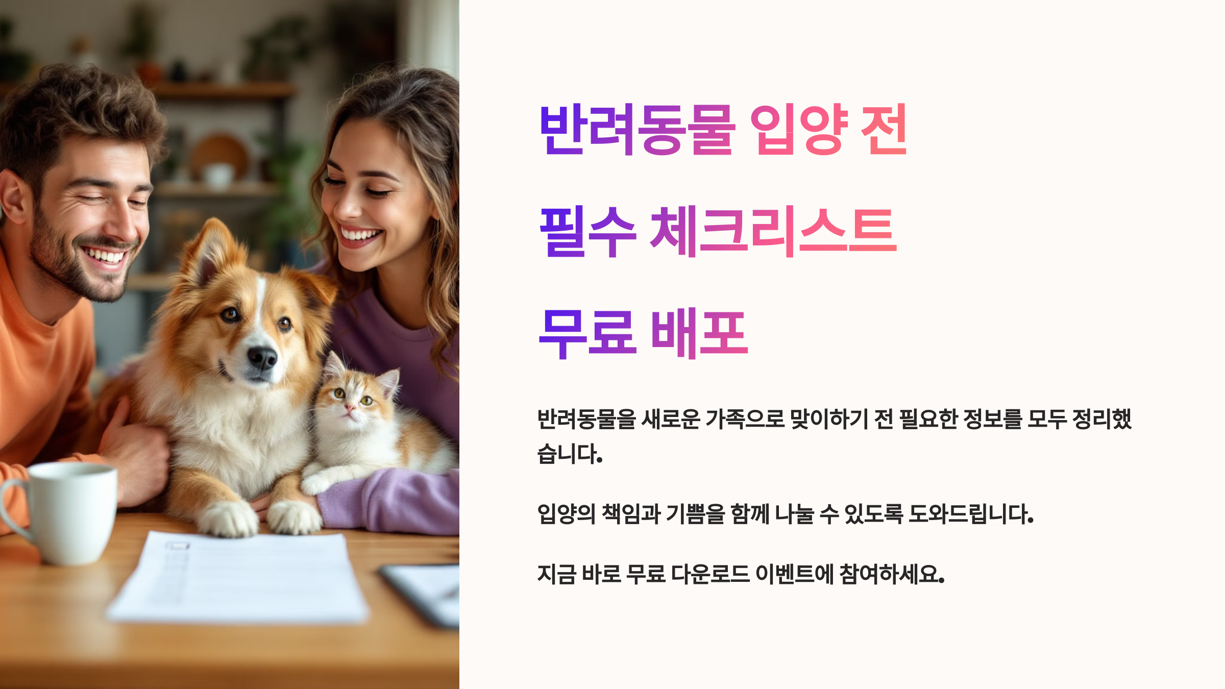 ✅ 위 항목 중 하나라도 자신 없거나 준비가 덜 되었다면, 입양을 조금 미루고 더 고민해보는 게 반려동물에게도 좋아요. 다음 섹션에서는 🧾 입양 체크리스트 무료 배포!에 대해 소개해드릴게요!