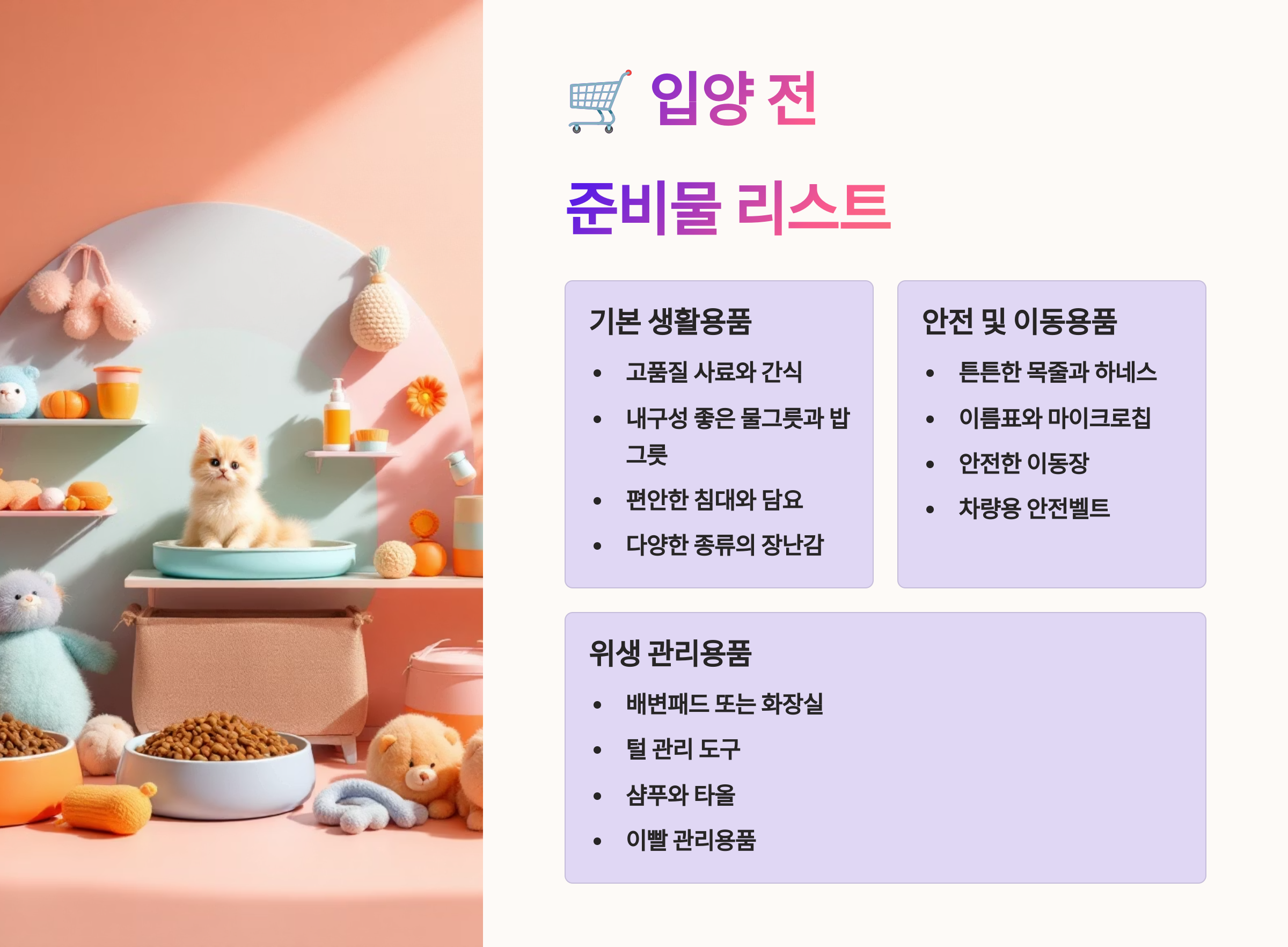 • 🛒 이동장, 사료, 식기 등 기초 장비는 미리 준비 필수!