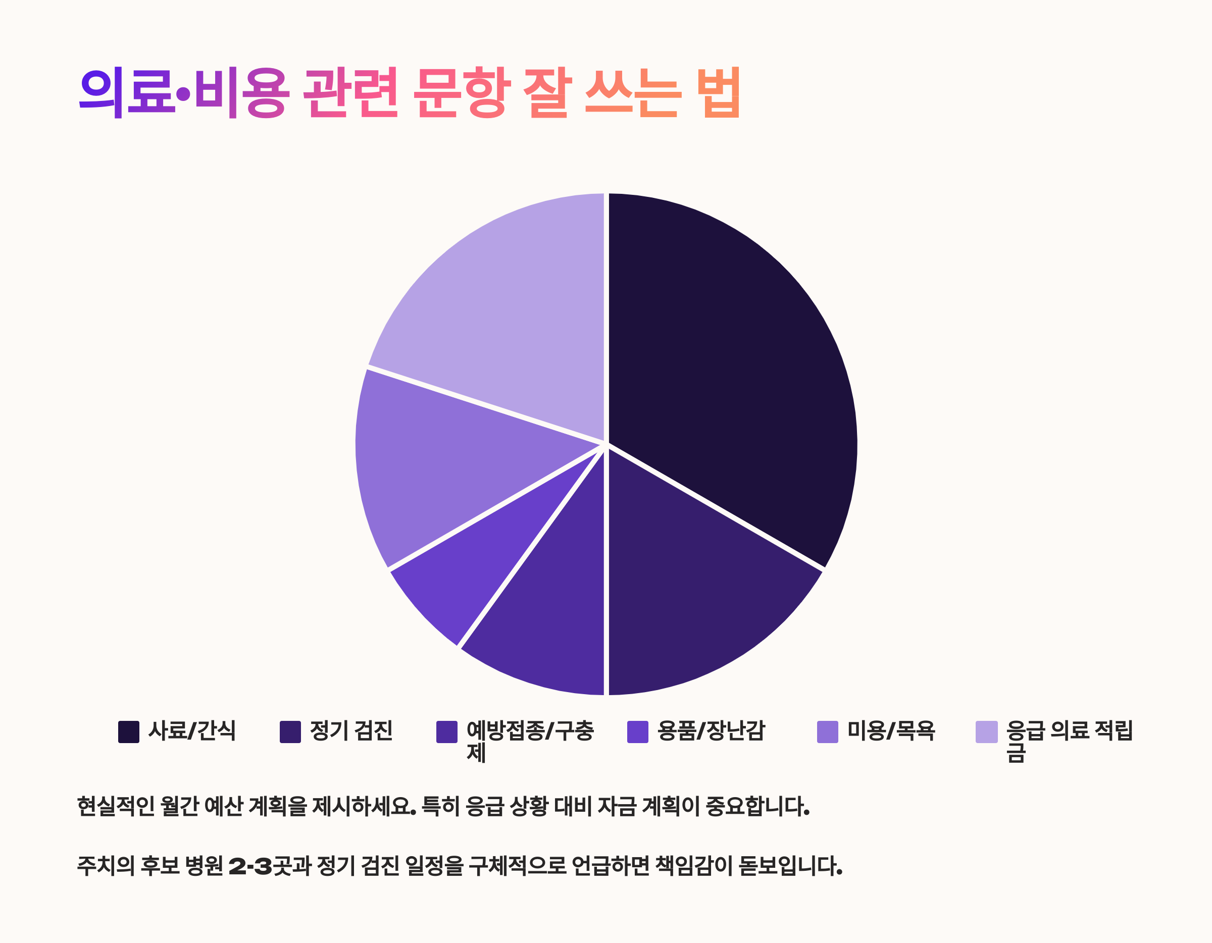이제 다음은 🩺 의료·비용 관련 문항 잘 쓰는 법 섹션이에요! 예방접종, 중성화, 응급 상황 대비 계획을 현실적으로 잘 표현하는 방법 알려드릴게요! 💉💸