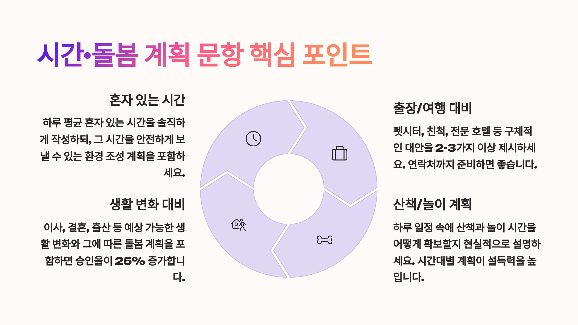 • 📍 부재 시간 동안 돌봄 방식(모니터링, 간식급여기 등) 언급
