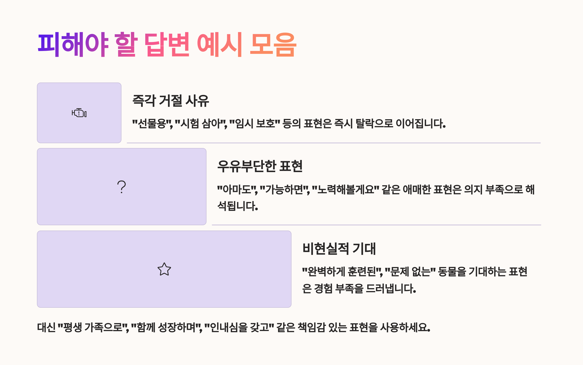 • “강아지는 키워봤으니까 문제 없어요.” → 너무 자신감만 강조하면 마이너스