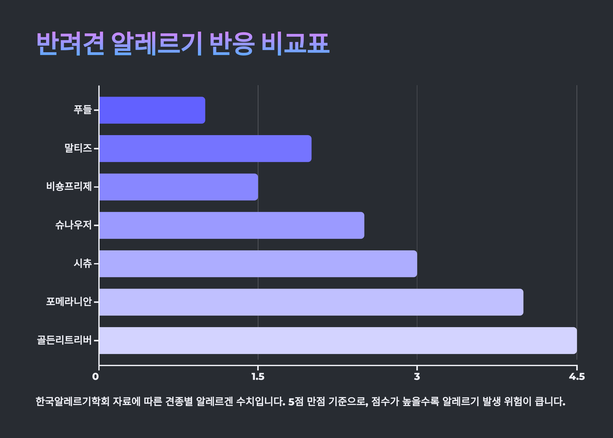 이 표를 보면 푸들과 비숑 프리제는 알레르겐 발생이 낮은 편이고, 골든 리트리버는 털 빠짐과 각질이 많아 민감한 사람에게는 피해야 할 수도 있어요. 🐕‍🦺❗