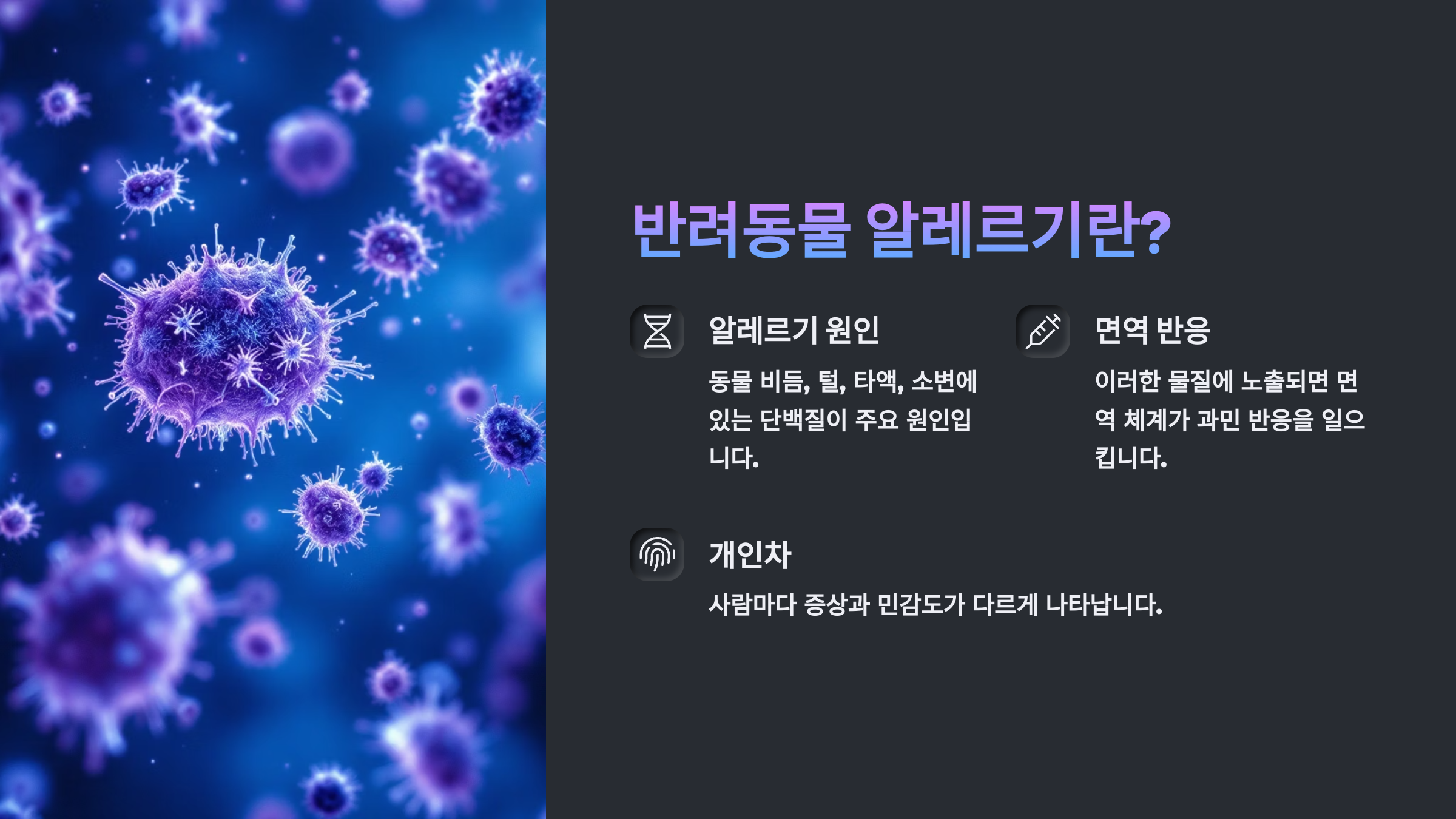 반려동물 알레르기란, 강아지나 고양이처럼 털이 있는 동물의 단백질 성분에 대해 면역 체계가 과민하게 반응하는 현상을 말해요. 흔히 털이 원인이라고 생각하지만, 사실 주된 원인은 피부각질, 침, 소변, 타액 등에 포함된 단백질이에요. 🧪